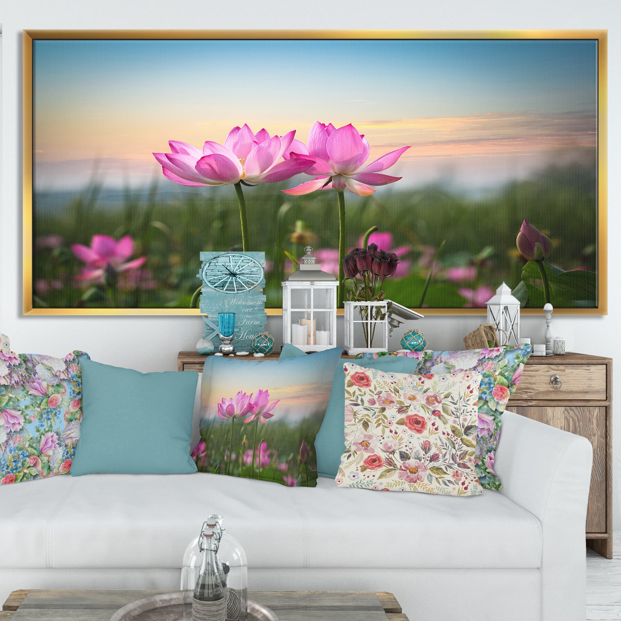 Designart - Blooming Lotus Flowers at Sunset - Floral Photo Framed Canvas Print