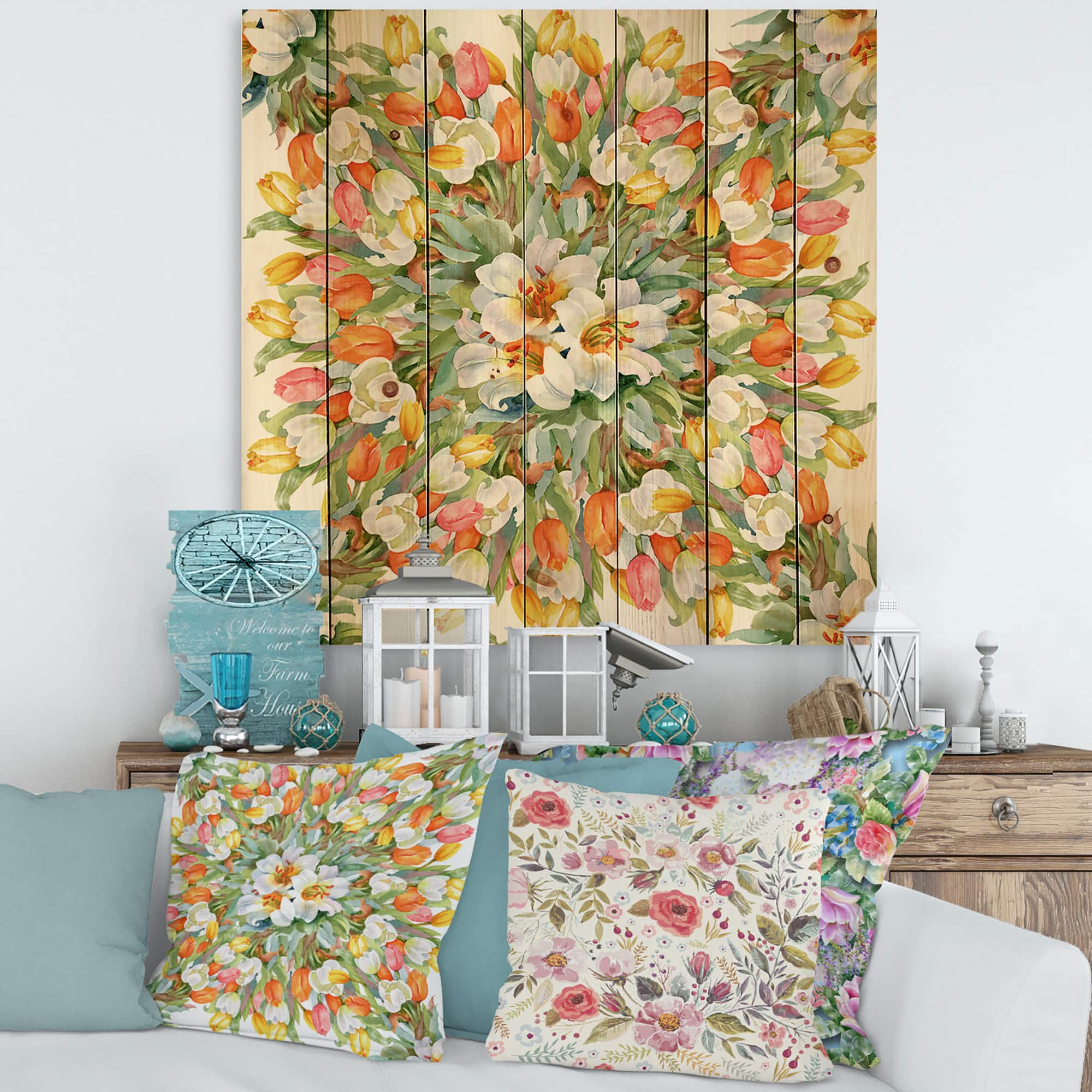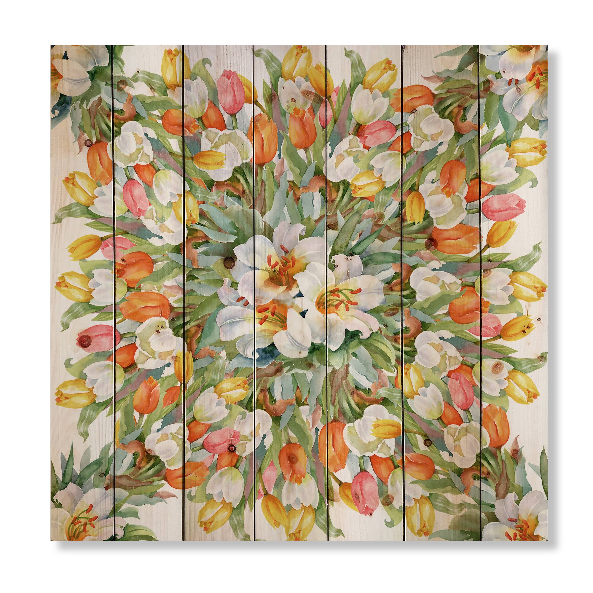 Designart - Blooming White and Orange Tulips II - Traditional Print on Natural Pine Wood