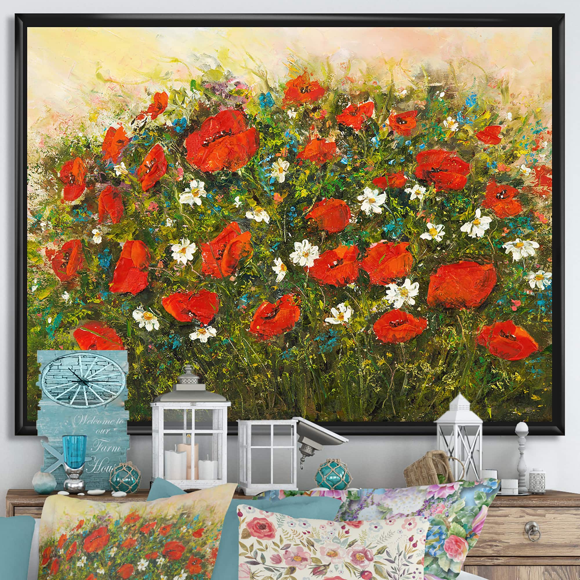 Designart - Blossoming Red Flower Fields - Farmhouse Canvas Wall Art Print in Black Frame