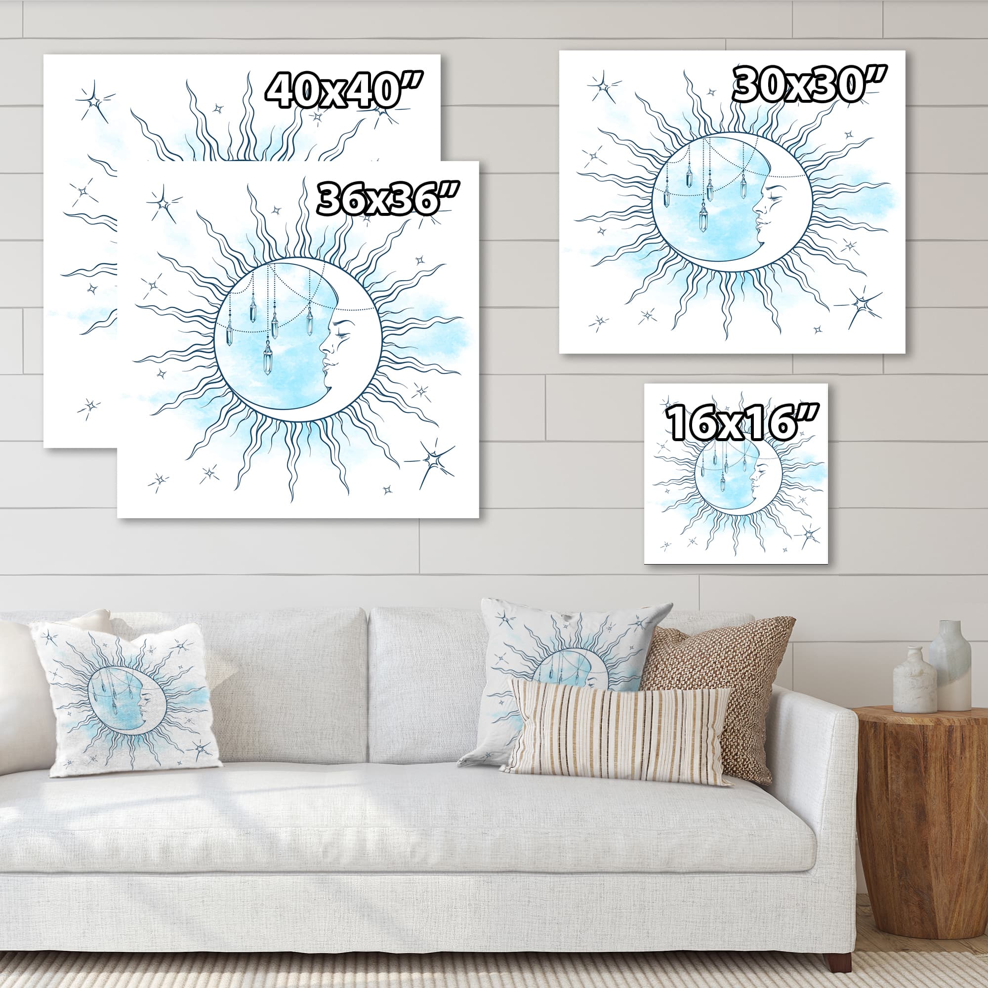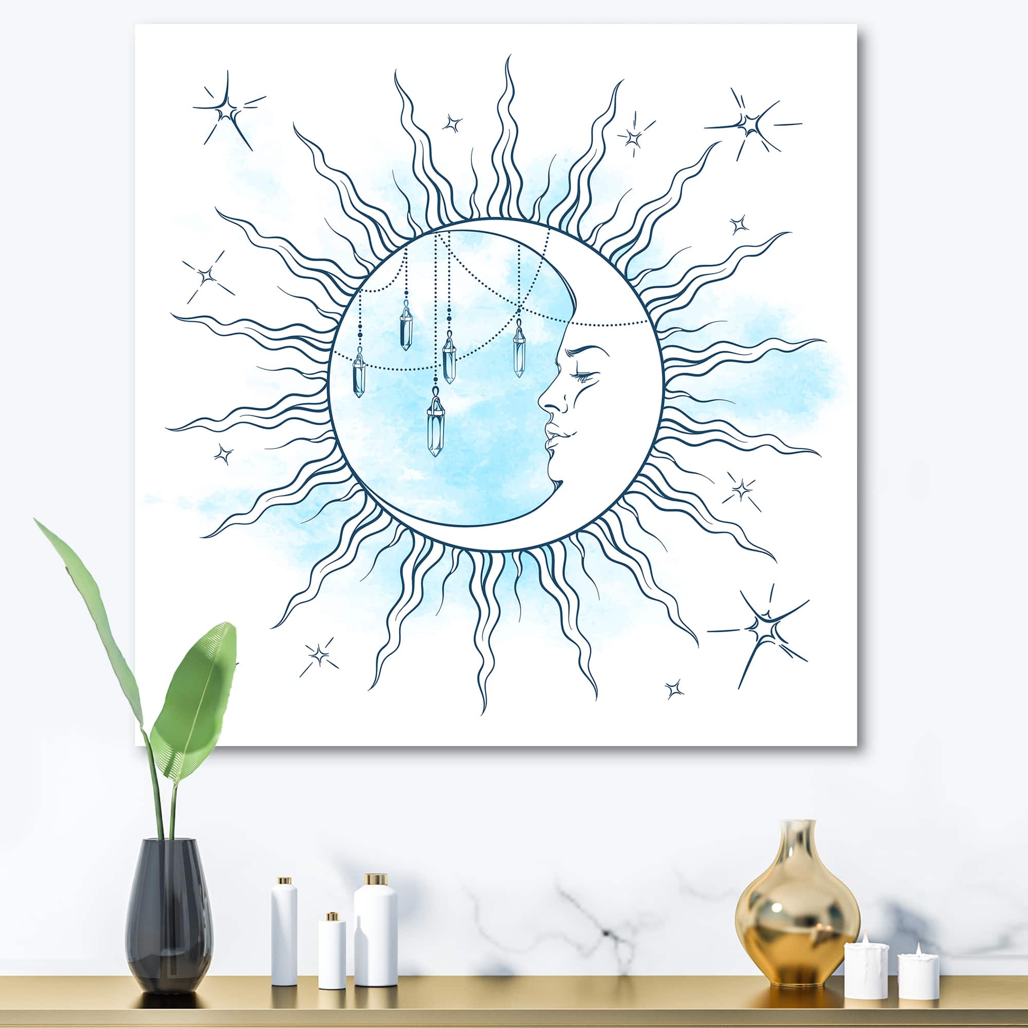 Designart - Blue Crescent Moon With Moonstone Pendants & Stars - Bohemian & Eclectic Canvas Wall Art Print
