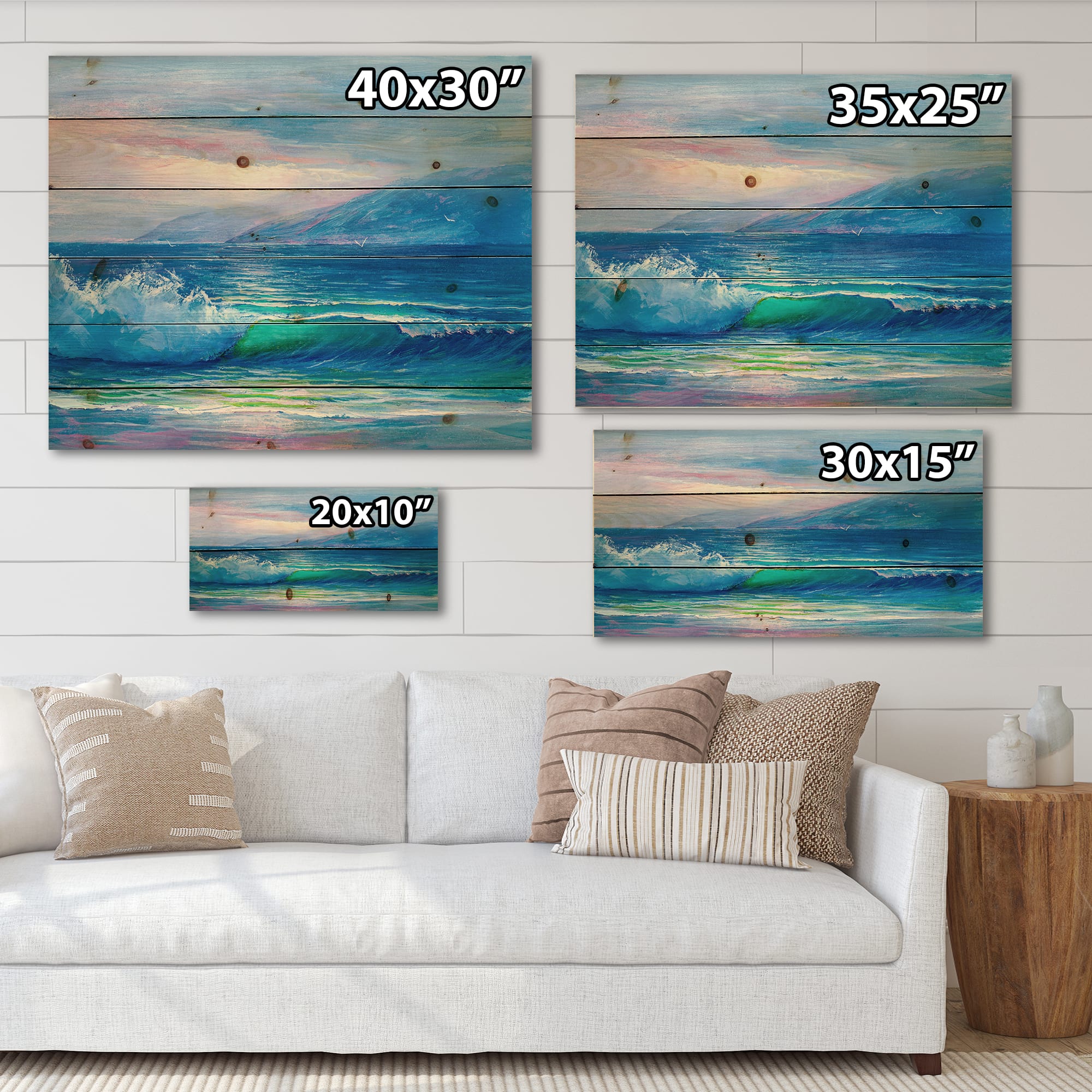 Designart - Blue Waves Breaking At The Beach II - Nautical & Coastal Print on Natural Pine Wood