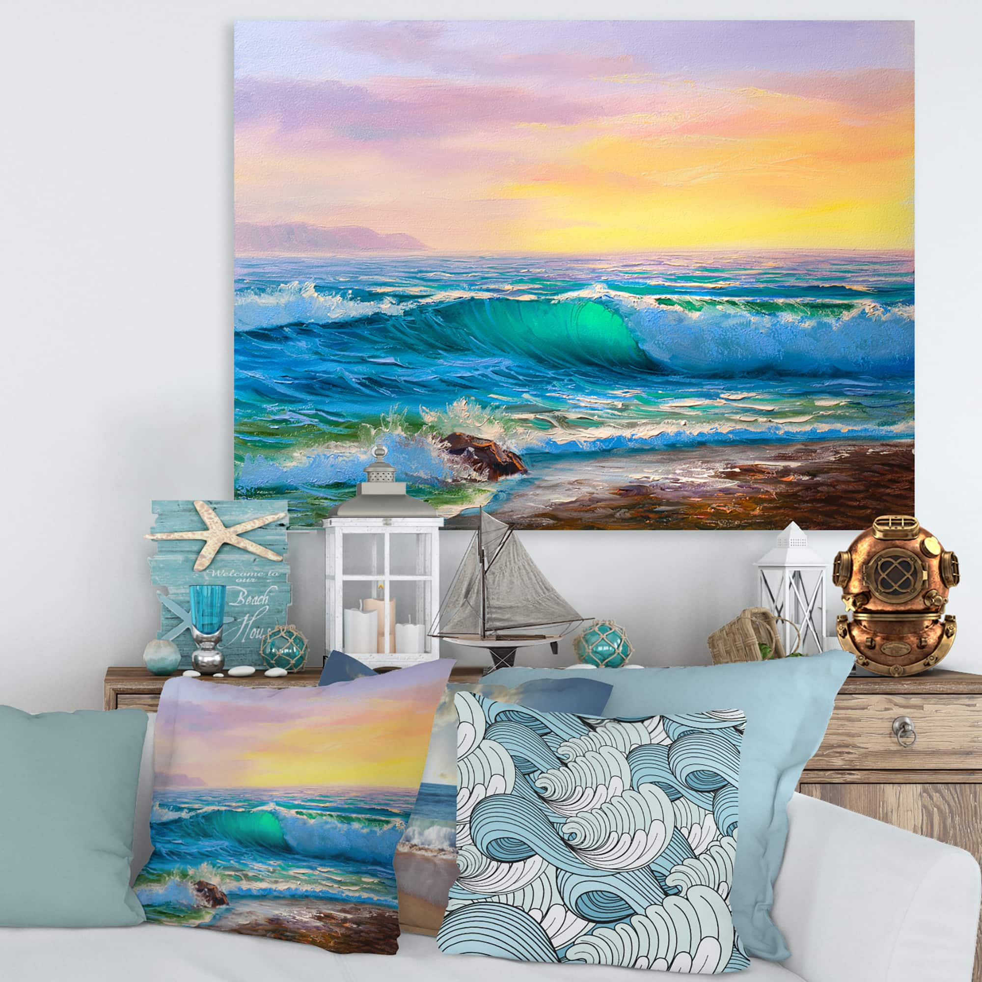 Designart - Blue Waves Breaking At The Beach IV - Nautical & Coastal Canvas Wall Art Print