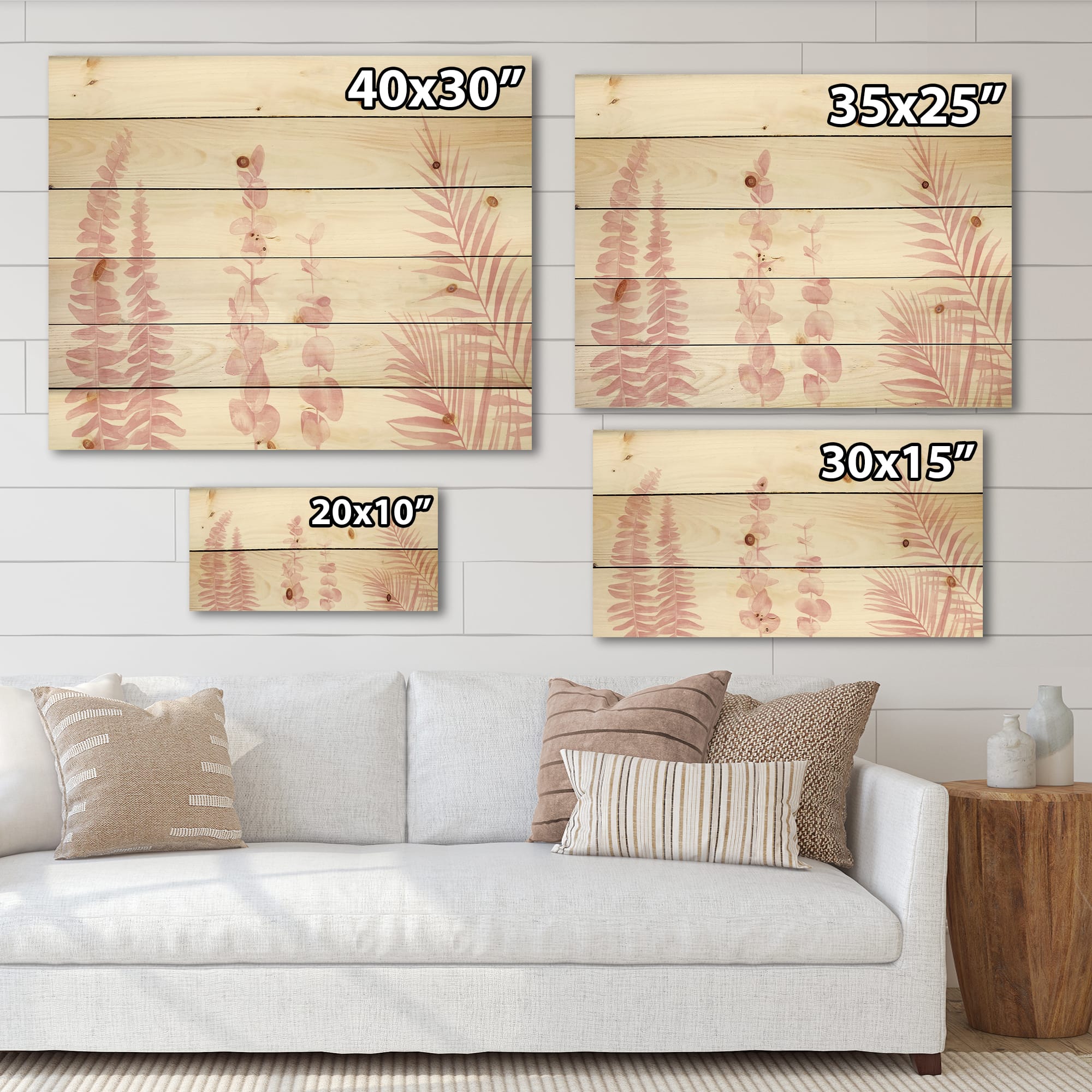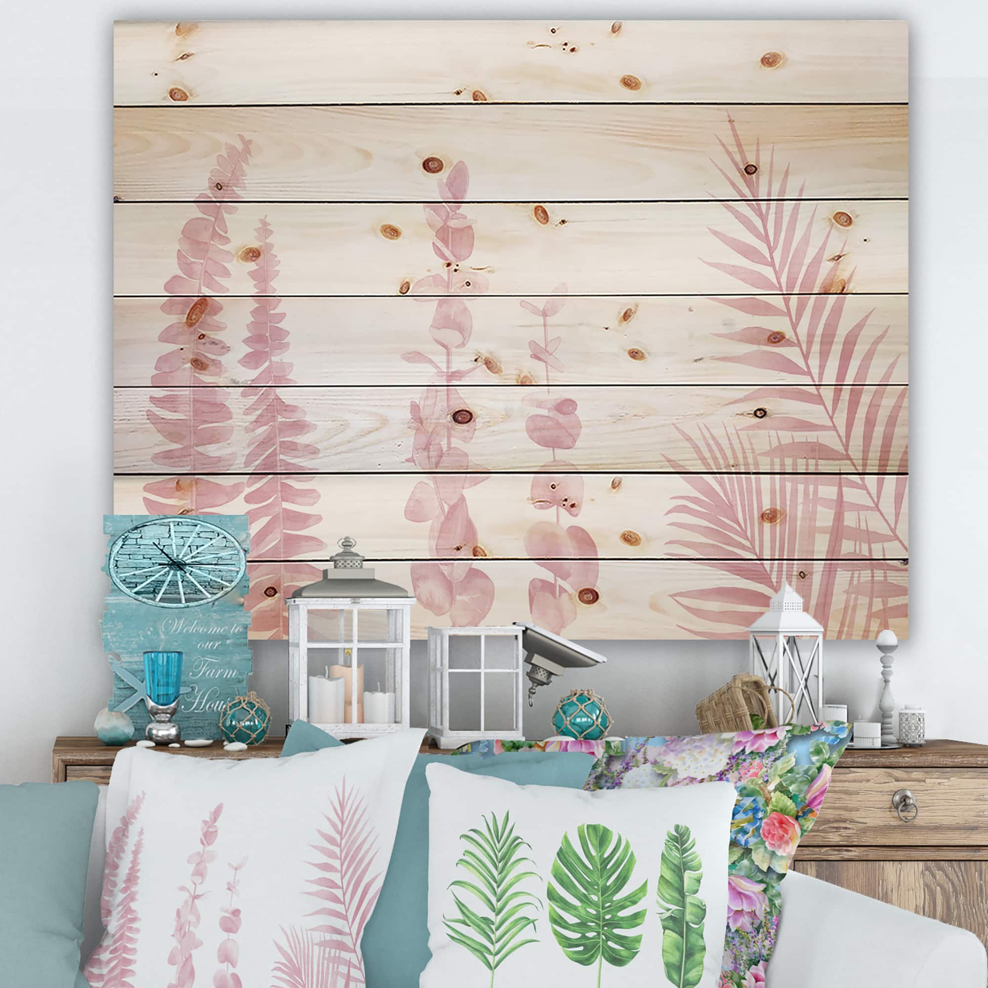 Designart - Blush Pinkeucalyptus and Palm Branches - Shabby Chic Print on Natural Pine Wood