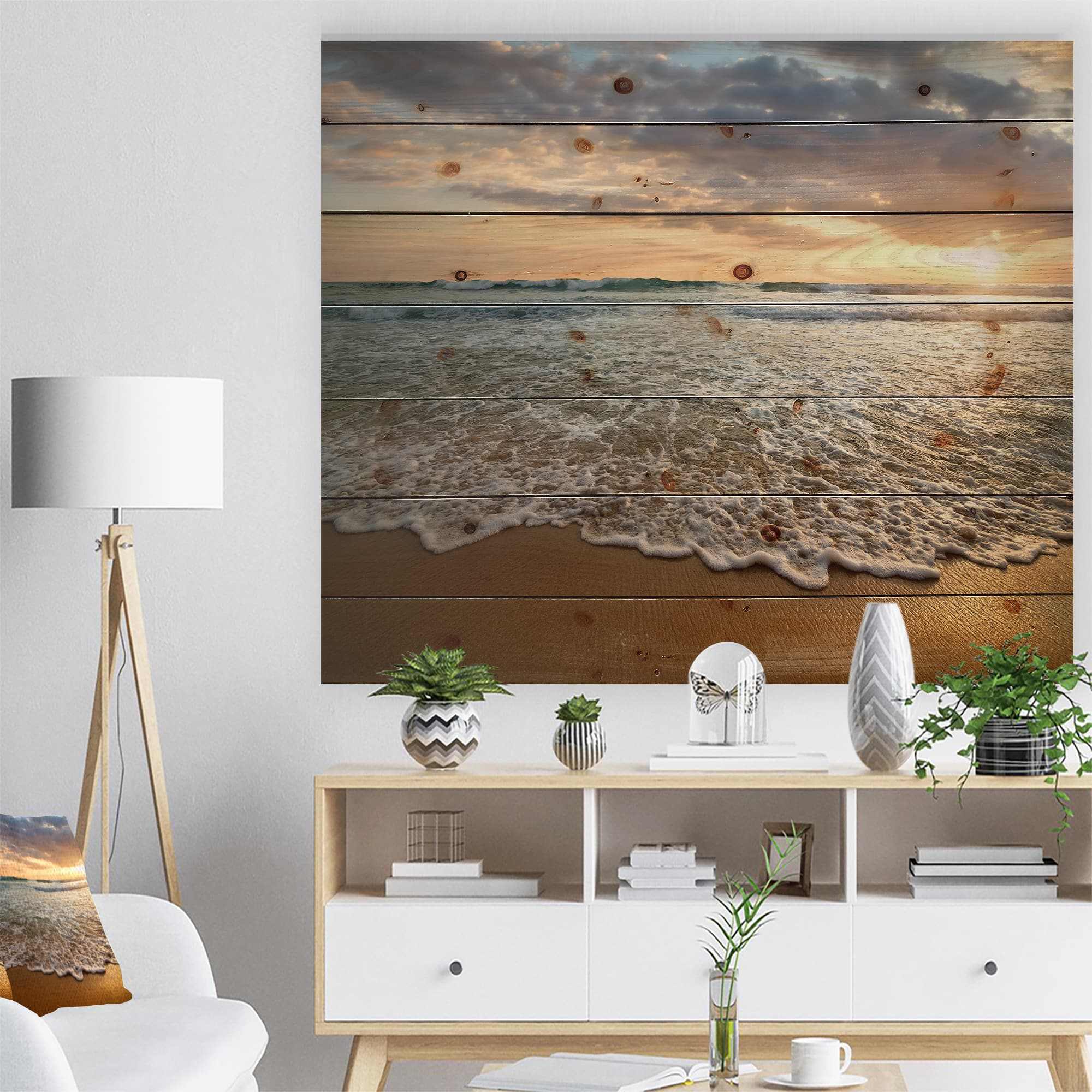 Designart - Bright Cloudy Sunset in Calm Ocean - Seashore Print on Natural Pine Wood