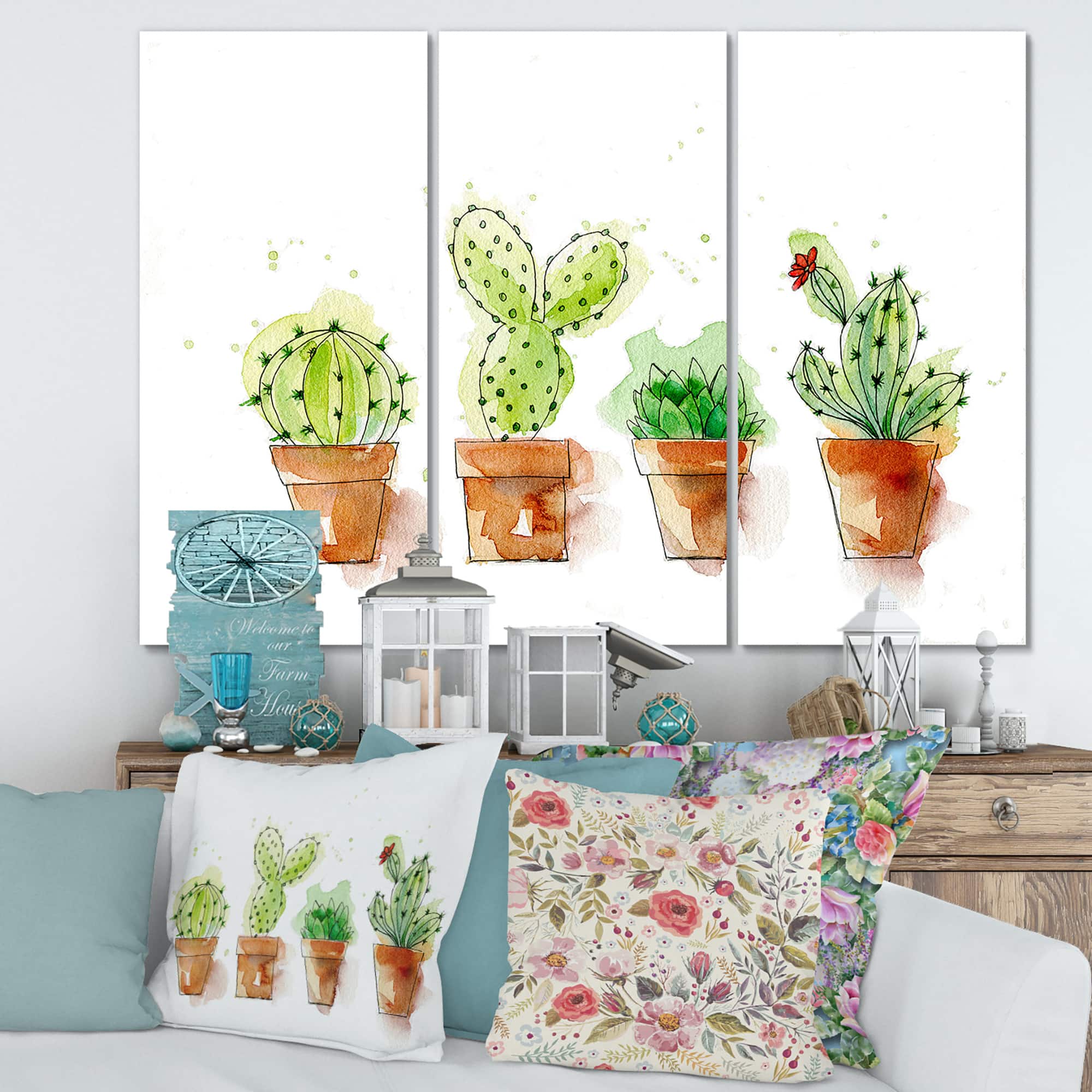 Designart - Cacti In Ceramic Pots In Gentle Tones I - Traditional Canvas Wall Art Print
