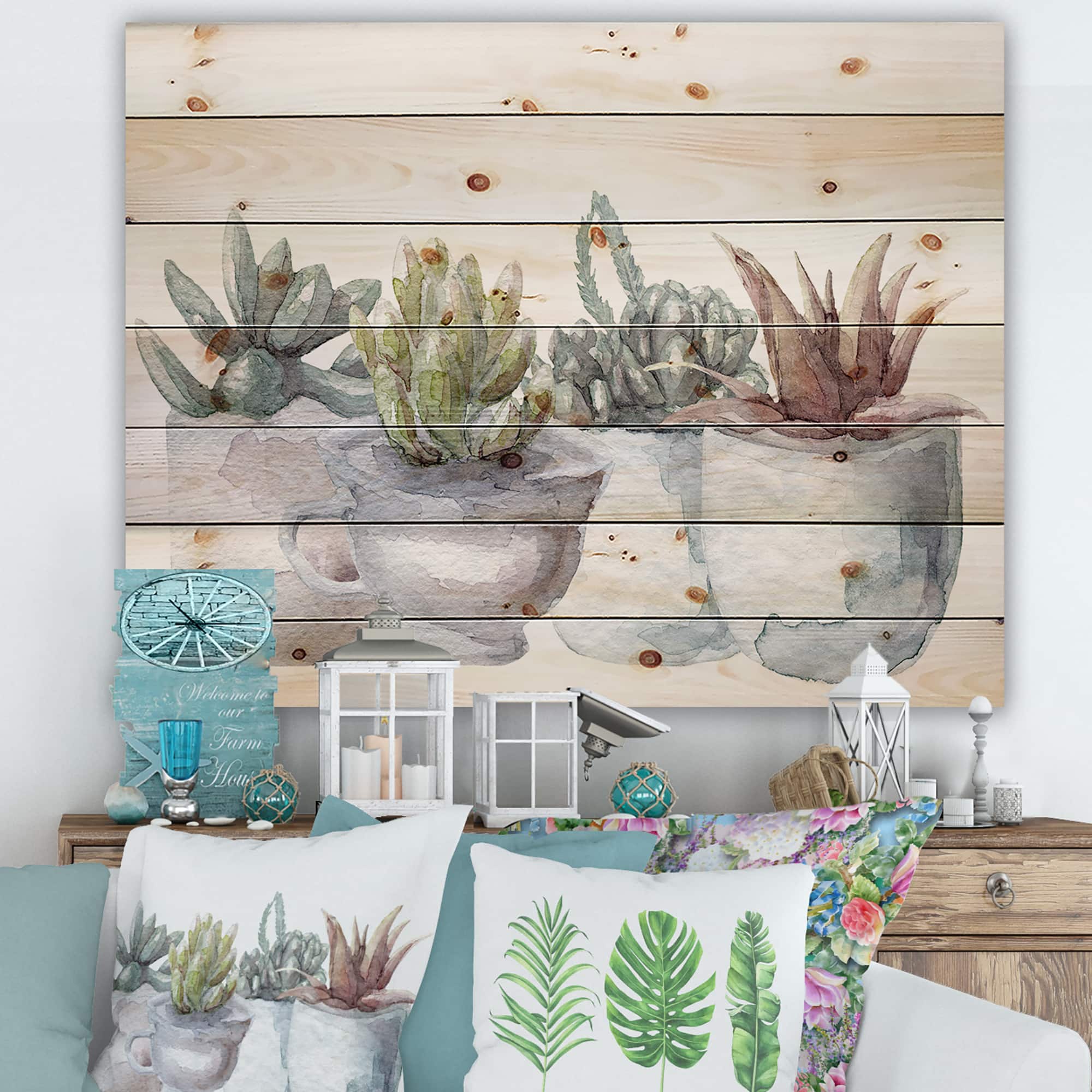 Designart - Cactus and Succulent House Plants IV - Botanical Print on Natural Pine Wood