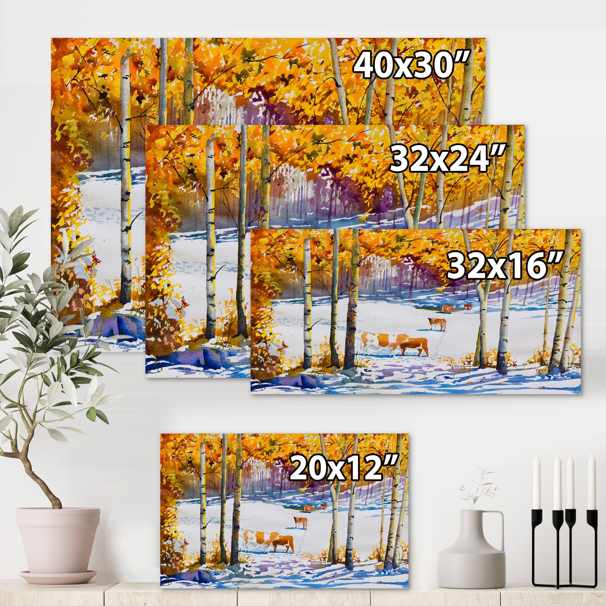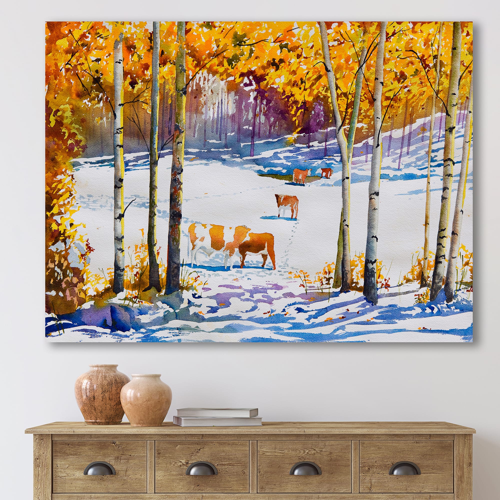 Designart - Cattle In The Early Snow In The Forest - Farmhouse Canvas Wall Art Print