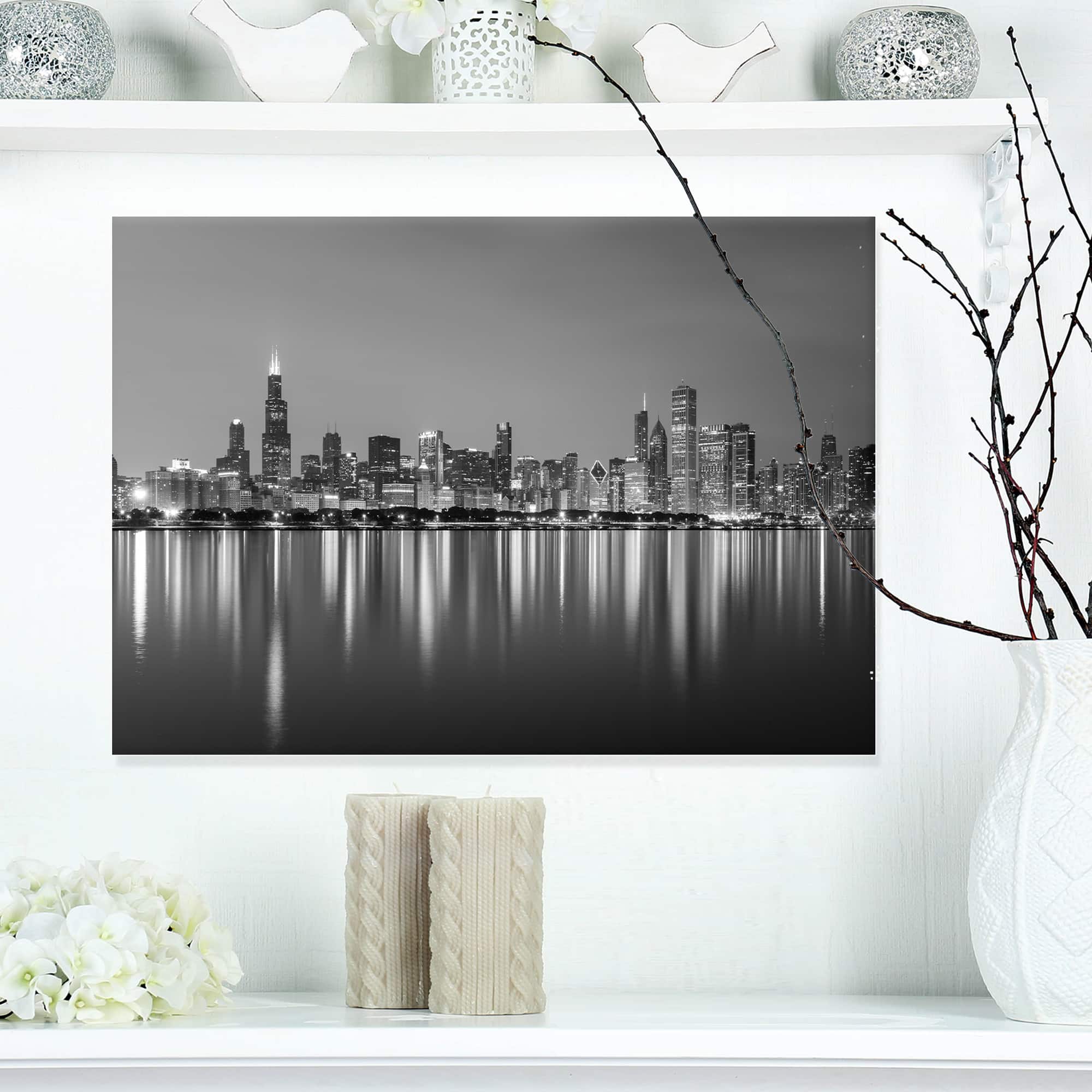Designart - Chicago Skyline at Night Black and White - Cityscape Canvas Print