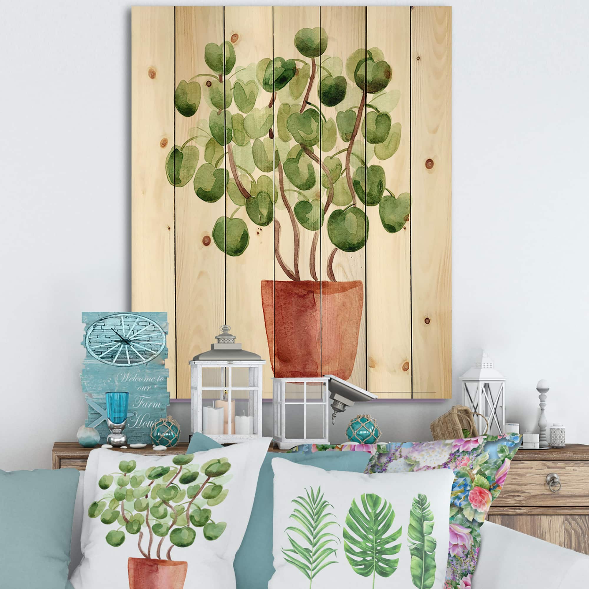 Designart - Chinese Money Plant In Pot - Traditional Print on Natural Pine Wood