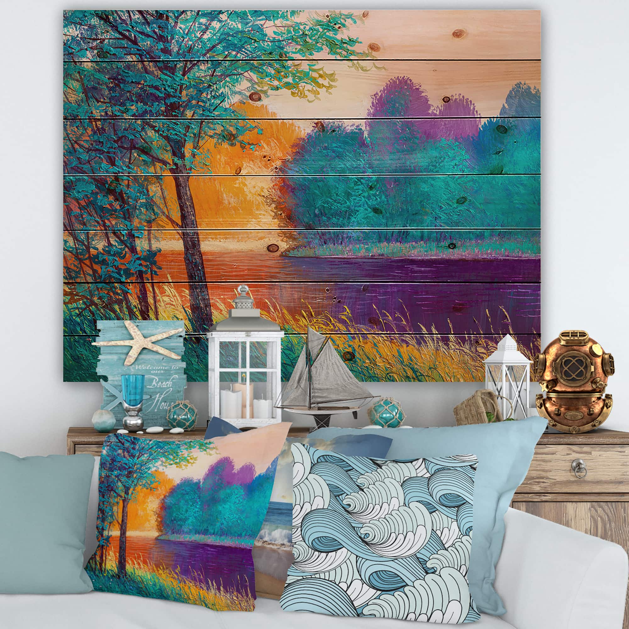 Designart - Colorful River Between The Trees During Twilight - Traditional Print on Natural Pine Wood