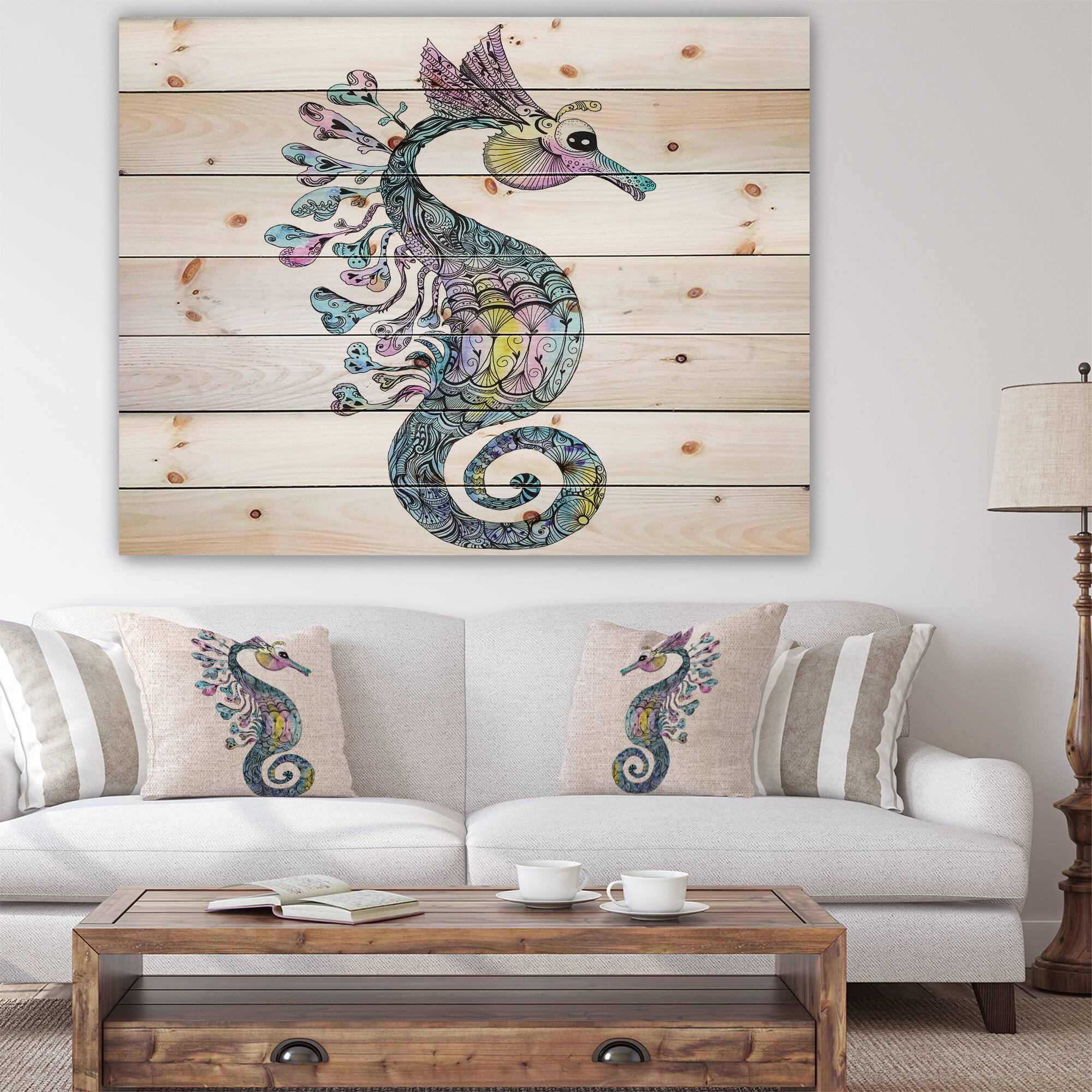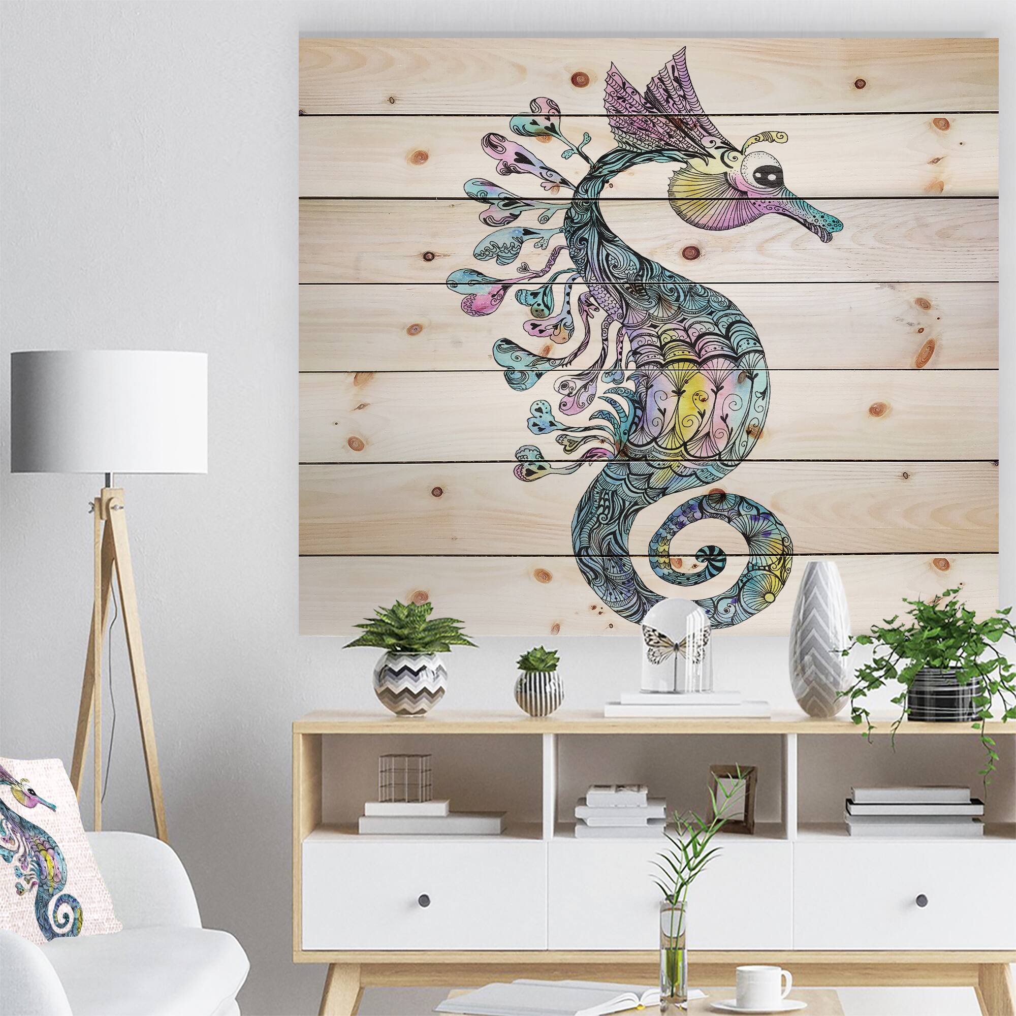 Designart - Colorful Seahorse Watercolor - Animal Art Print on Natural Pine Wood