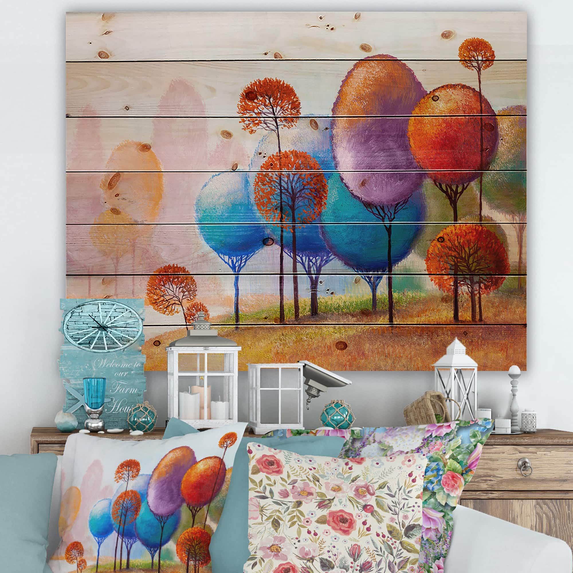 Designart - Colourful Trees Impression III - Traditional Print on Natural Pine Wood