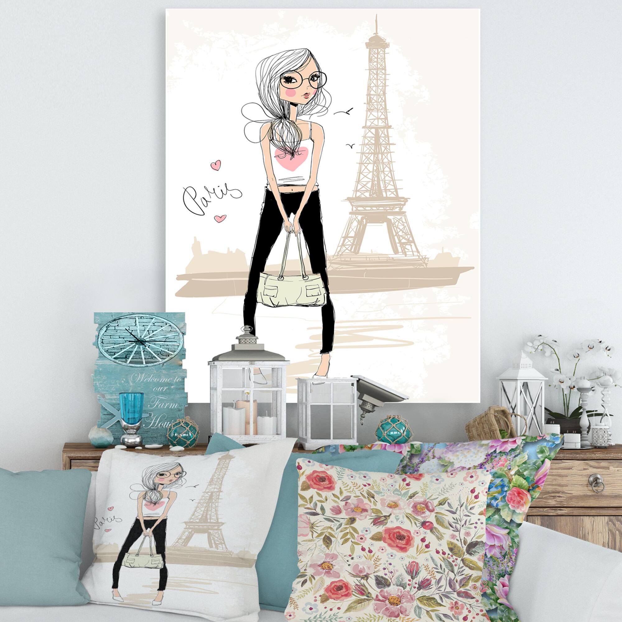 Designart - Cute Girl By The Tour Eiffel In Paris - Children's Art Canvas Wall Art Print
