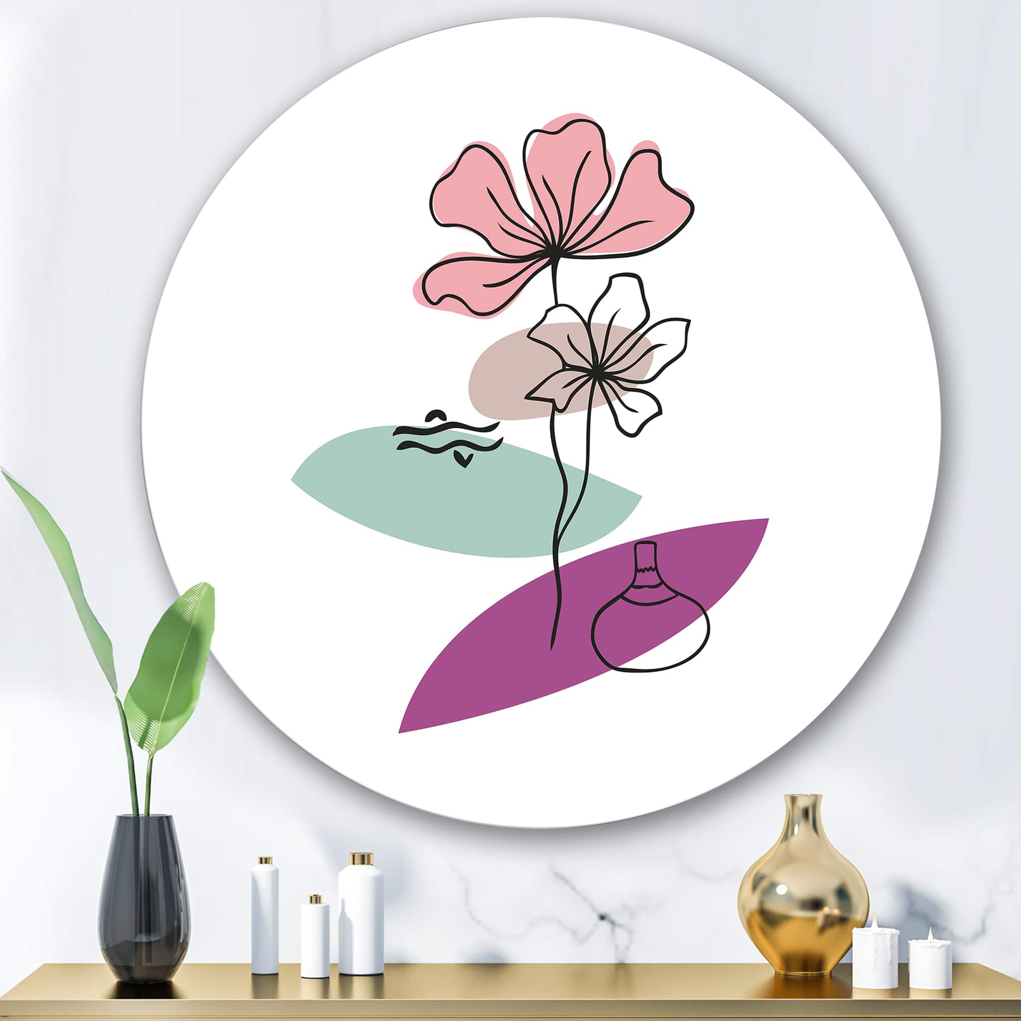 Designart - Elementary Shapes With Abstract Flowers Plants IV - Modern Metal Circle Wall Art