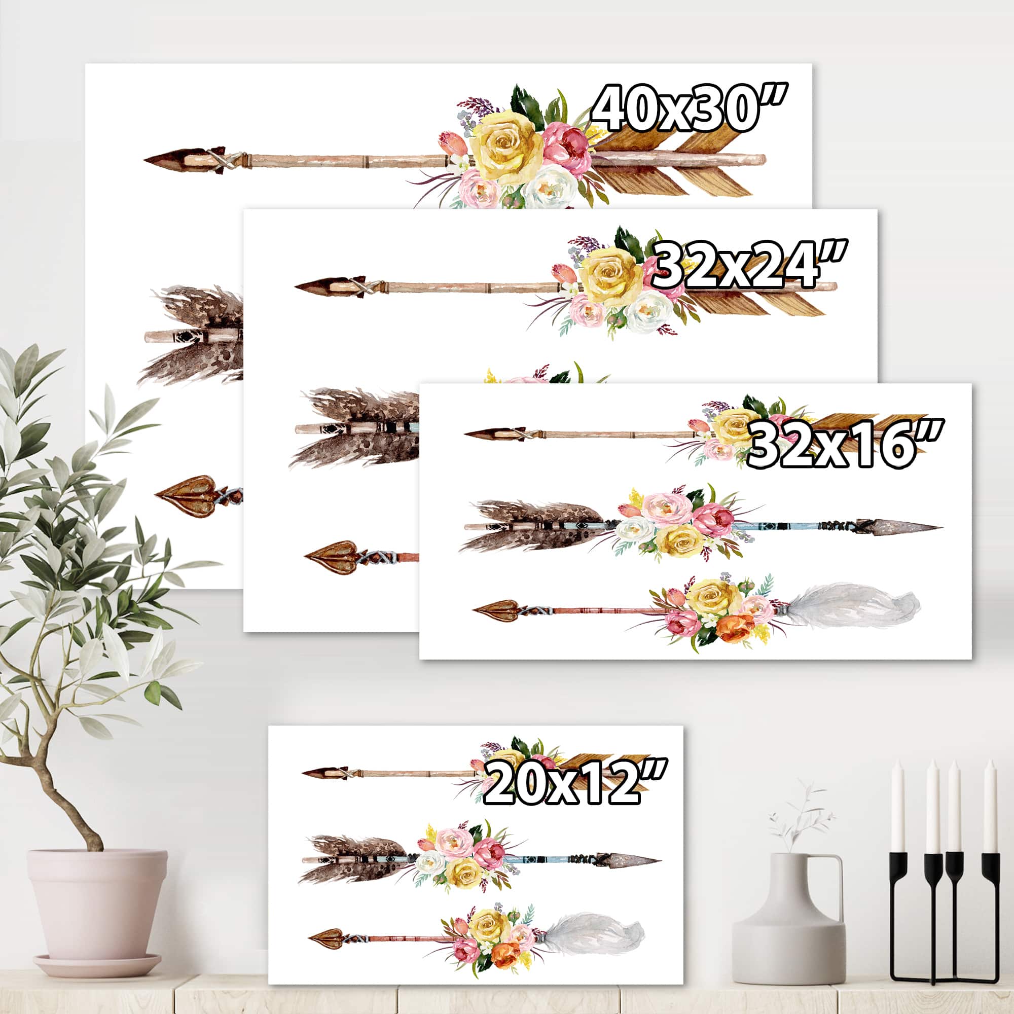 Designart - Ethnic Feathers and Flowers On Native Arrows II - Bohemian & Eclectic Canvas Wall Art Print