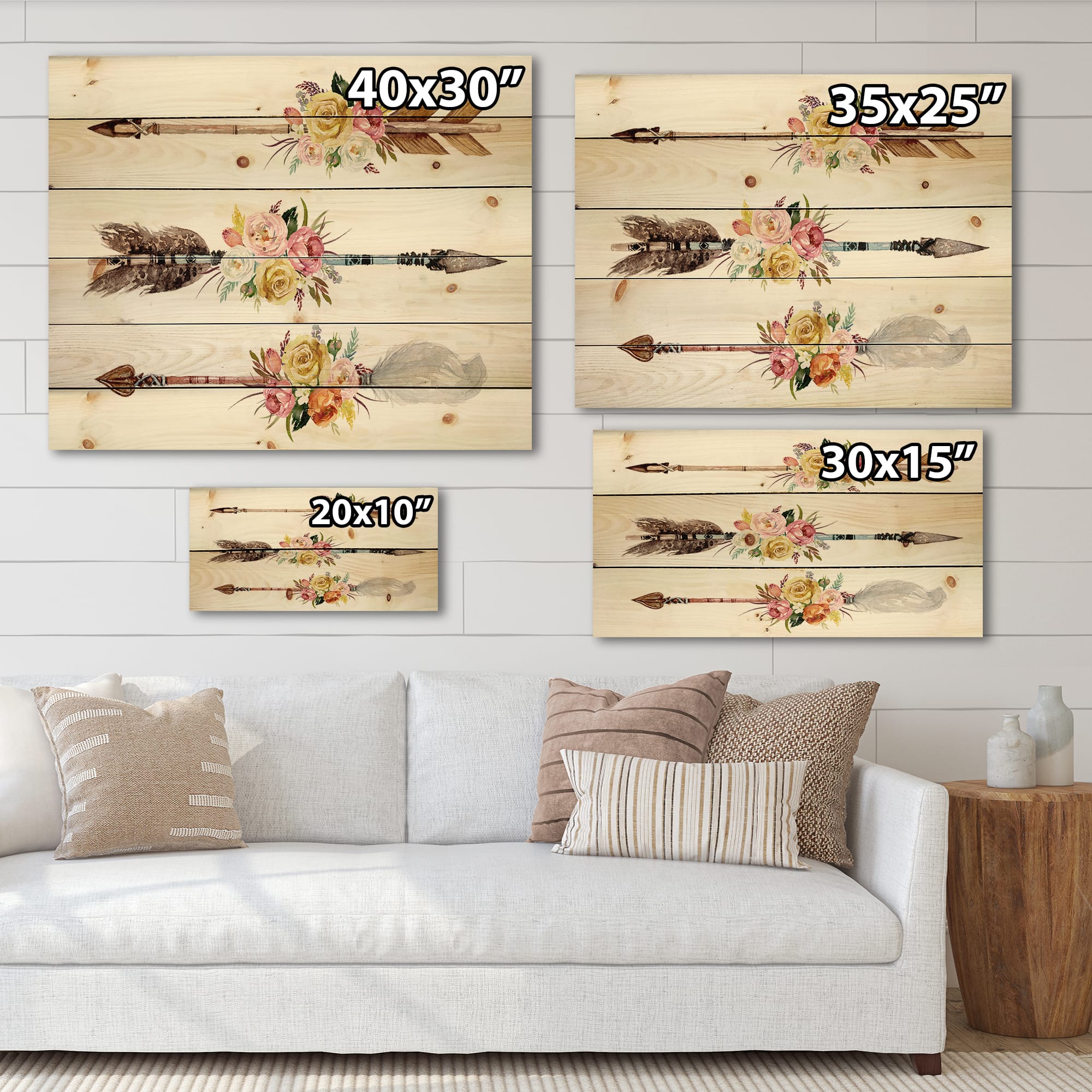 Designart - Ethnic Feathers and Flowers On Native Arrows II - Bohemian & Eclectic Print on Natural Pine Wood