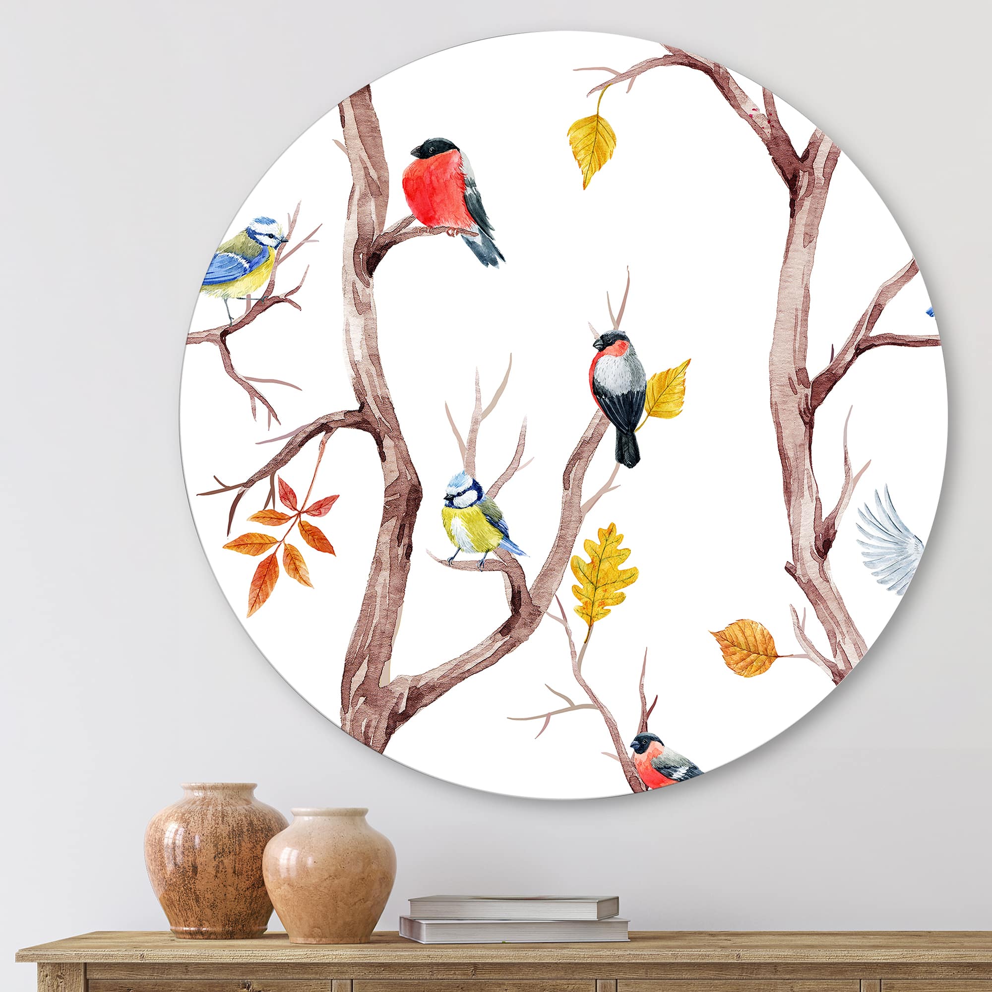 Designart - Fall Trees and Little Birds - Traditional Metal Circle Wall Art