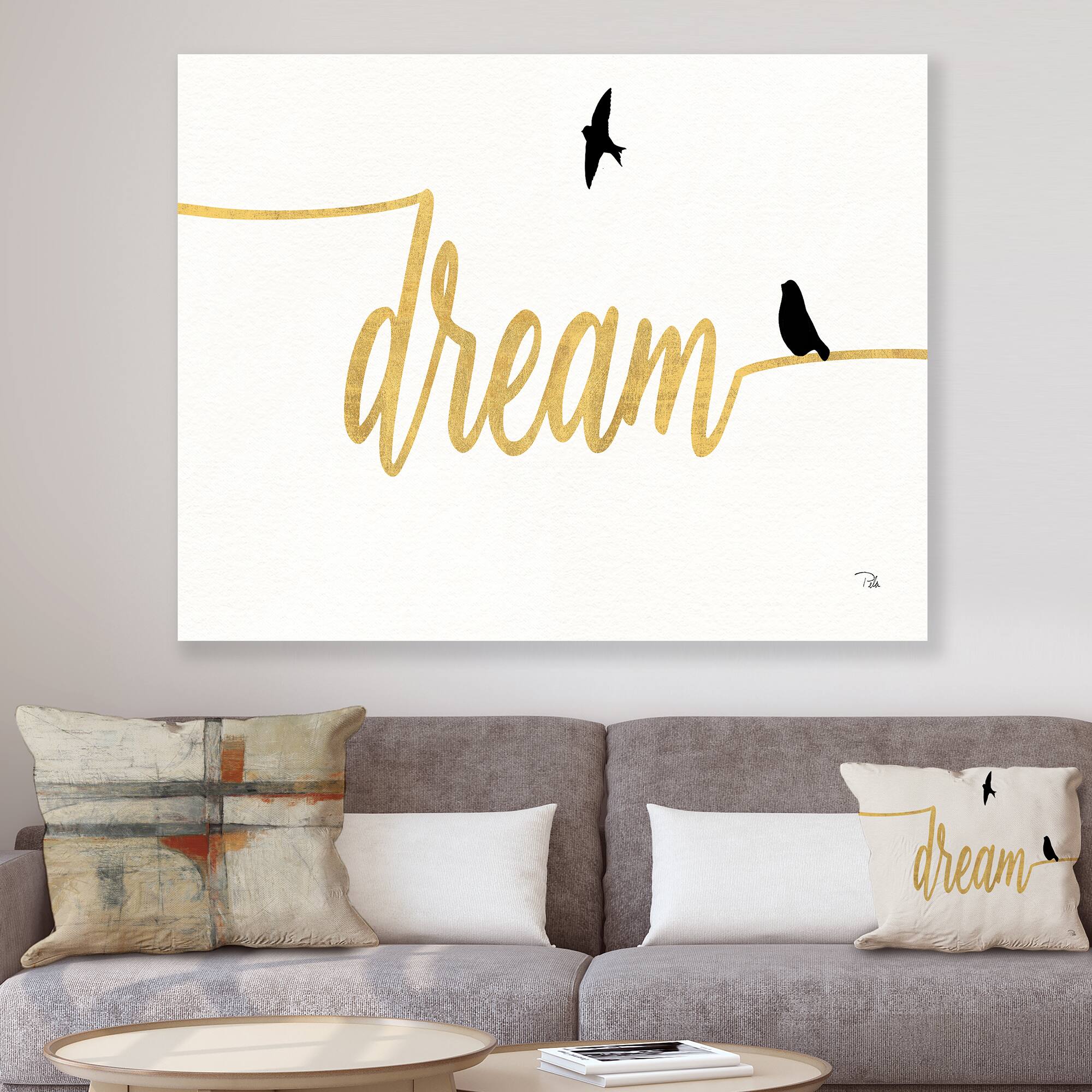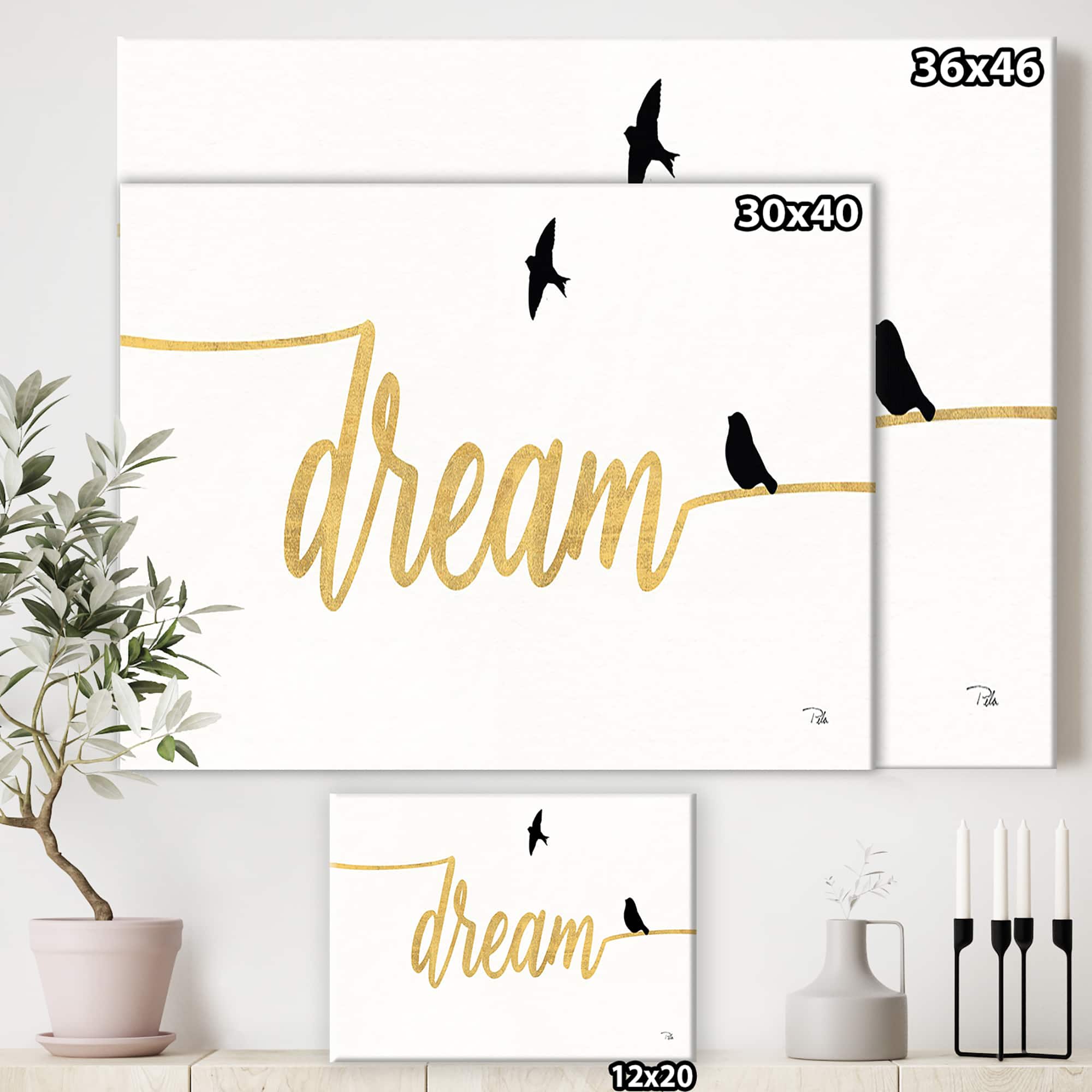 Designart - Family of Birds on Gold Words II - Cottage Canvas Artwork