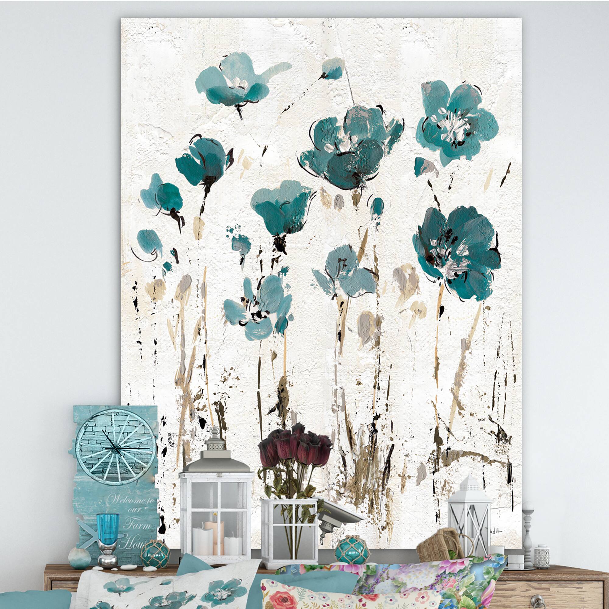 Designart - Fields of Turquoise Watercolor Flower I - Traditional Premium Canvas Wall Art