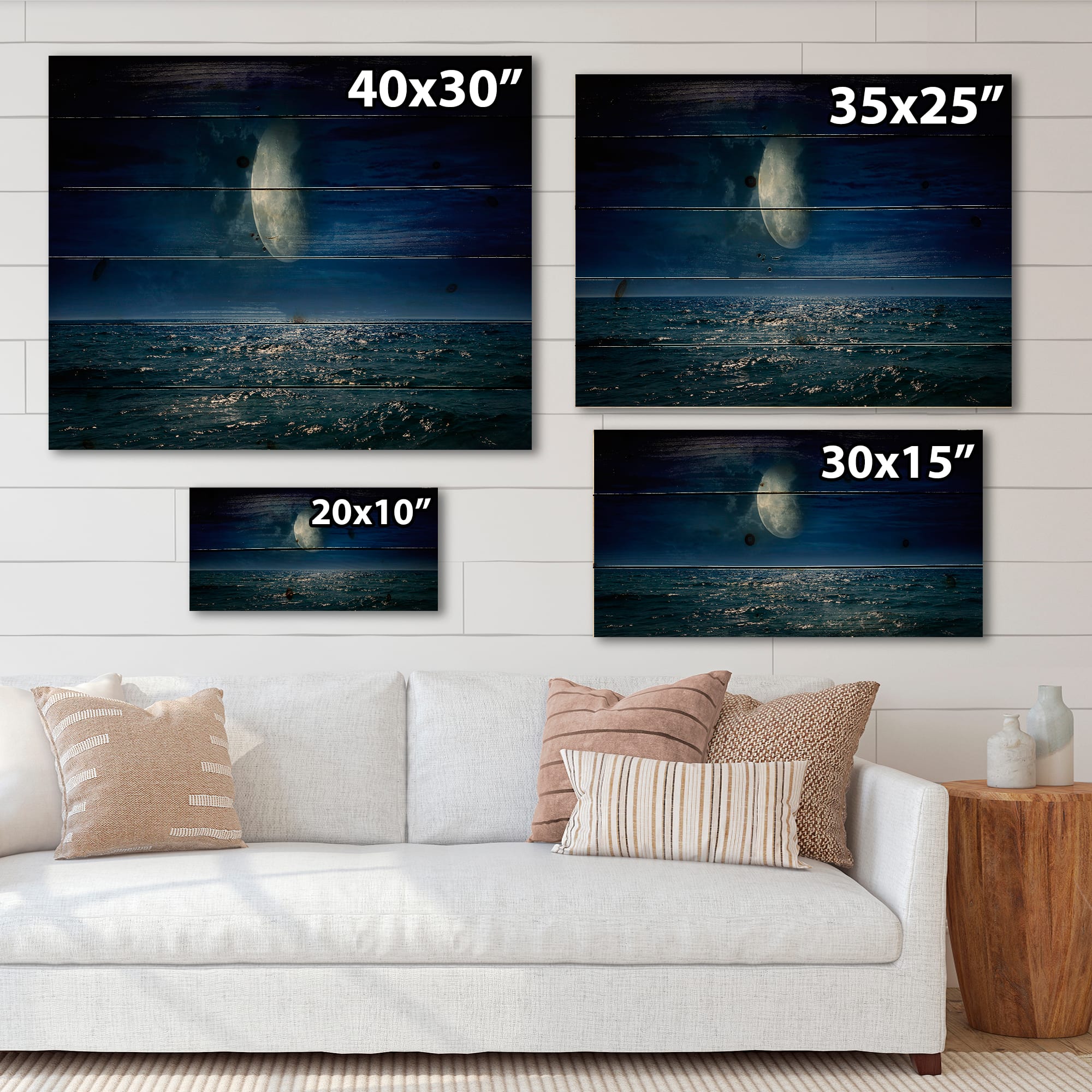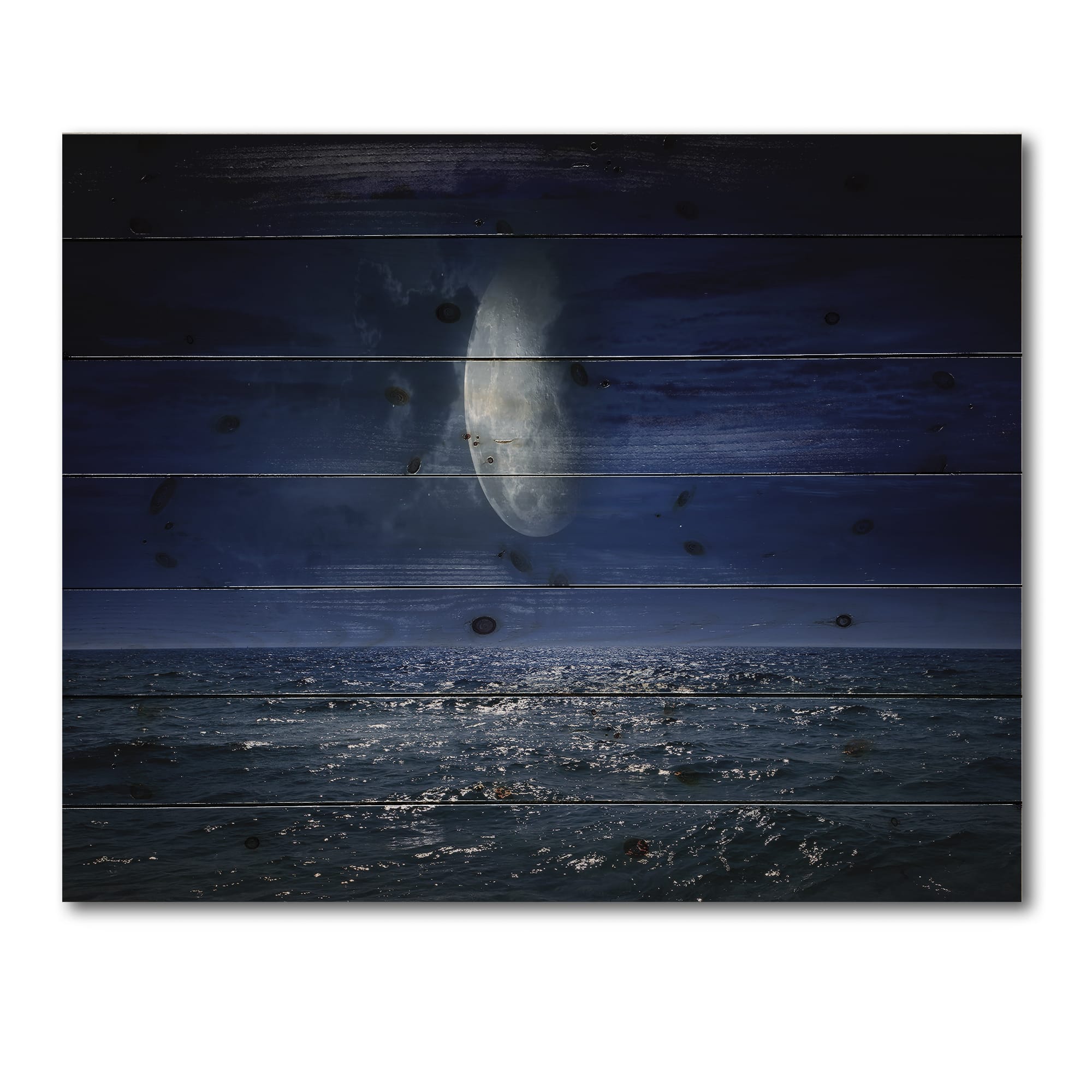 Designart - Full Moon Over Dark Ocean At Night - Nautical & Coastal Print on Natural Pine Wood