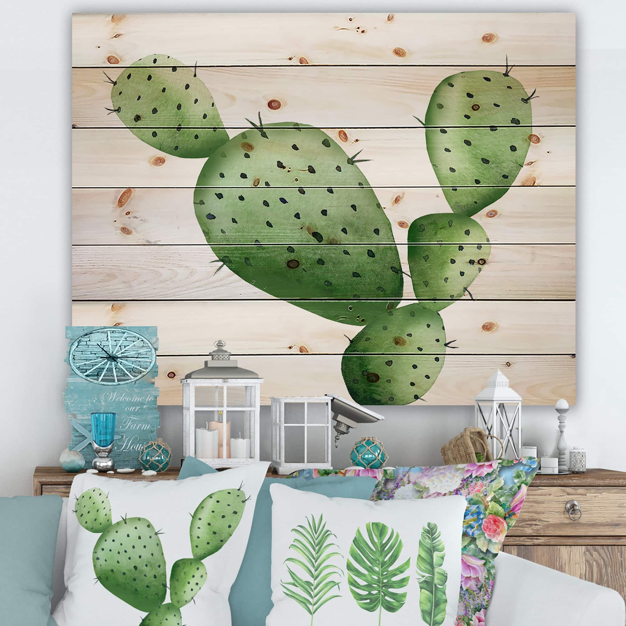 Designart - Green Southwestern Cactus - Botanical Print on Natural Pine Wood