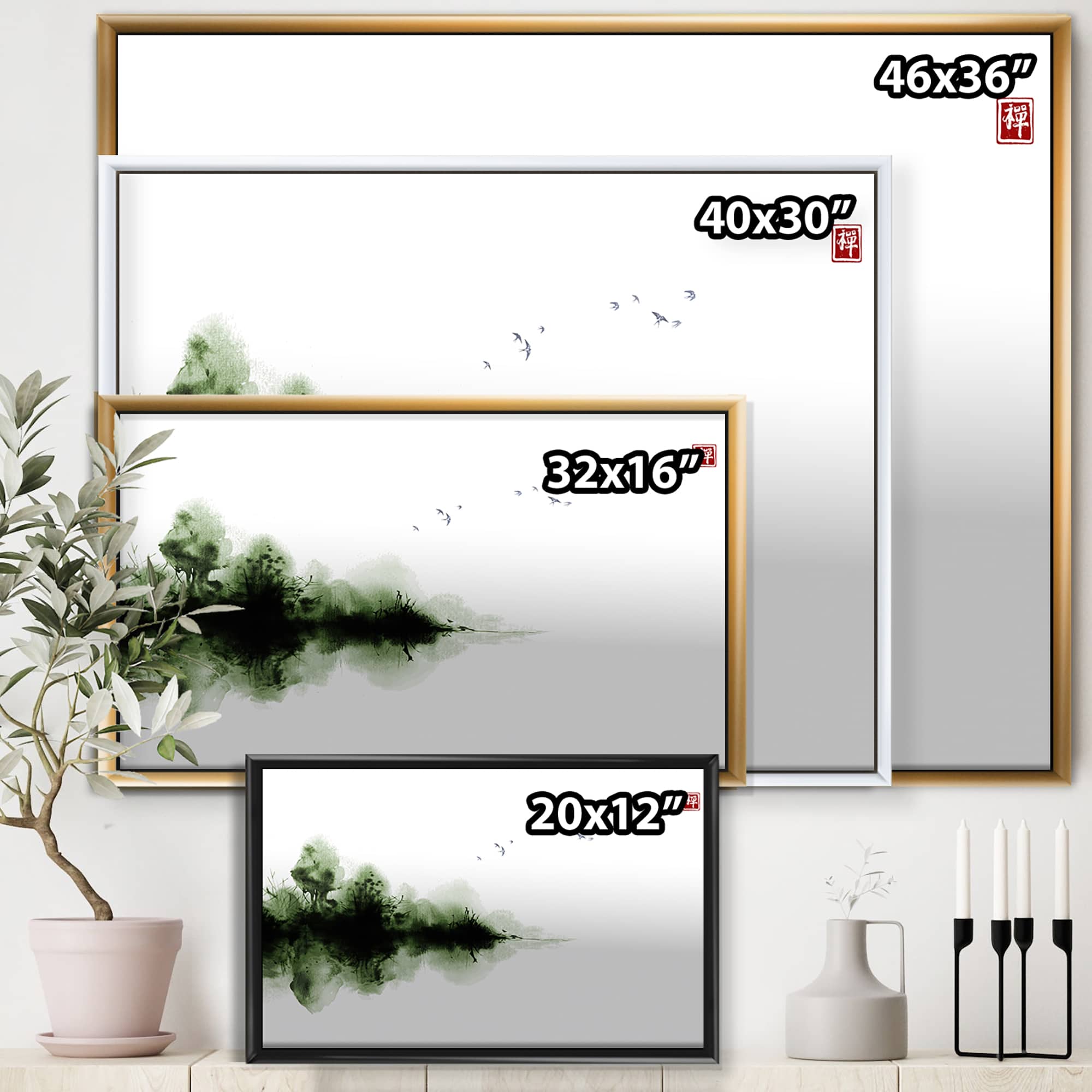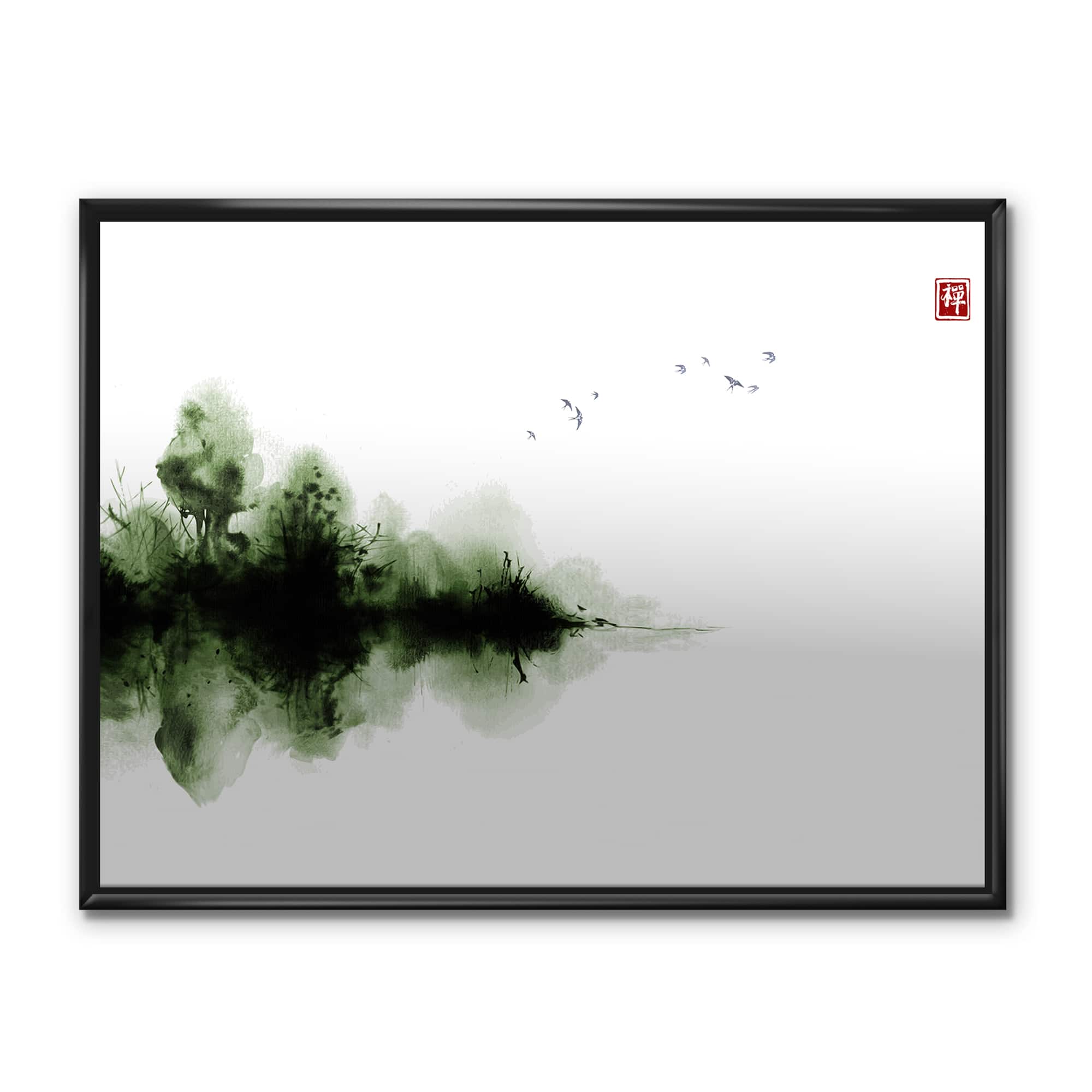 Designart - Japanese Red Moon In Traditional Sumi-e Painting I - Traditional Canvas Wall Art Print in Black Frame