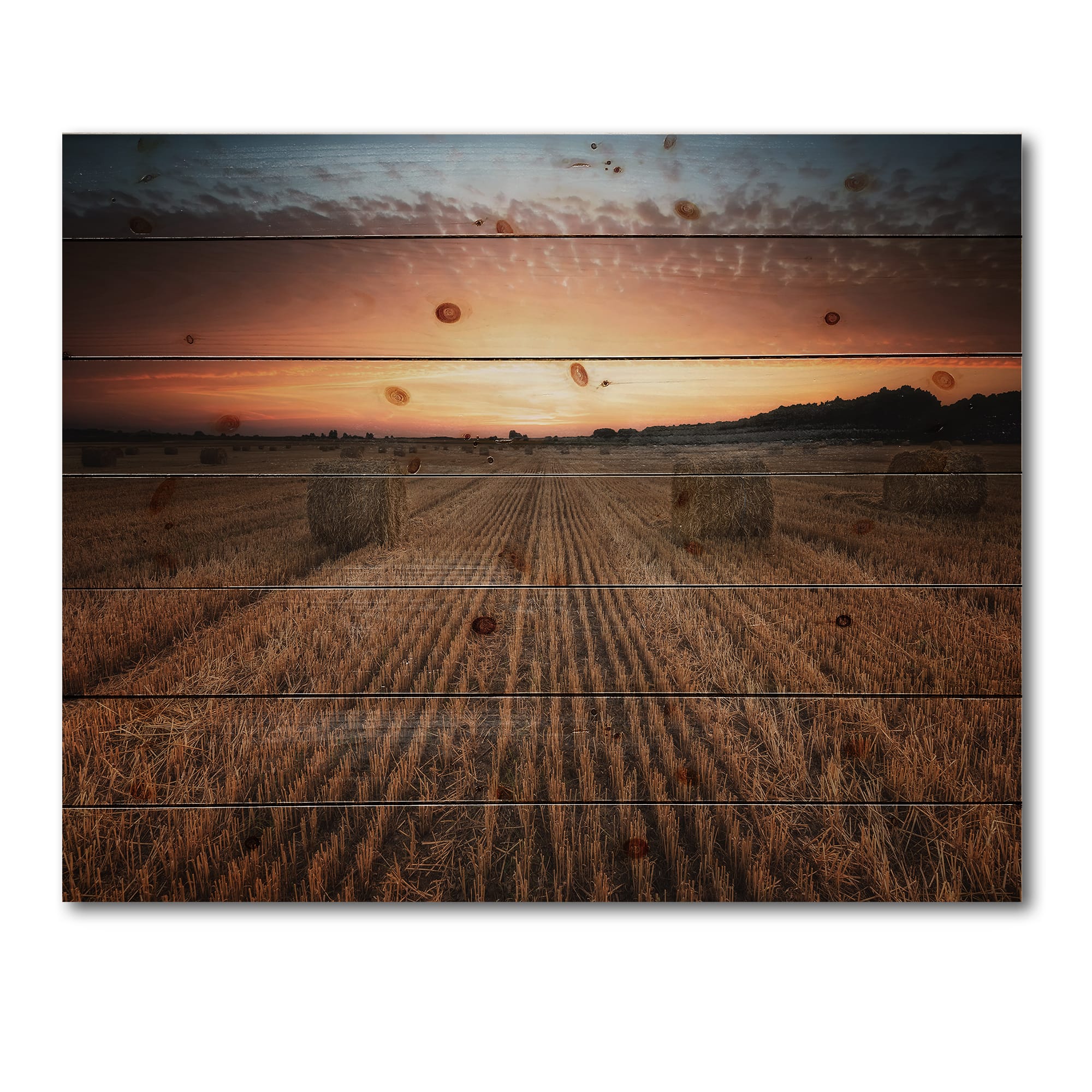 Designart - Landscape With A Field Full of Hay Bales At Sunset - Farmhouse Print on Natural Pine Wood