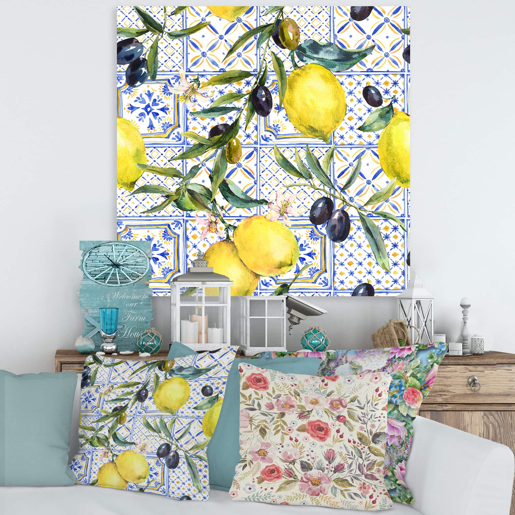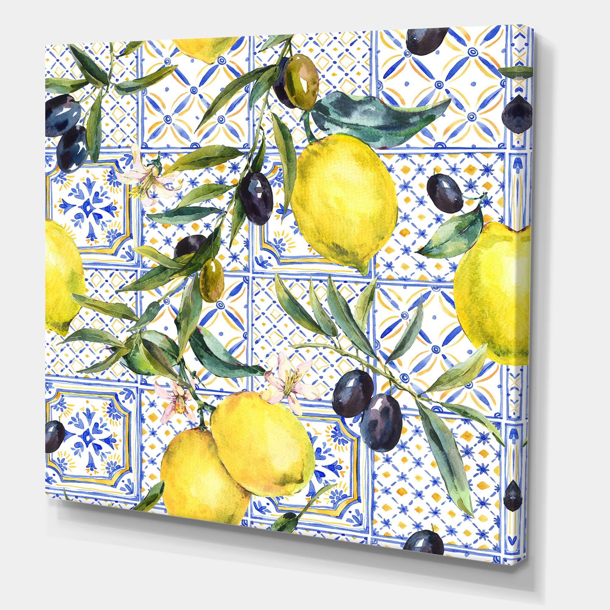 Designart - Lemon Ornament On Blue Geometrical Pattern III - Tropical Canvas Wall Art Print