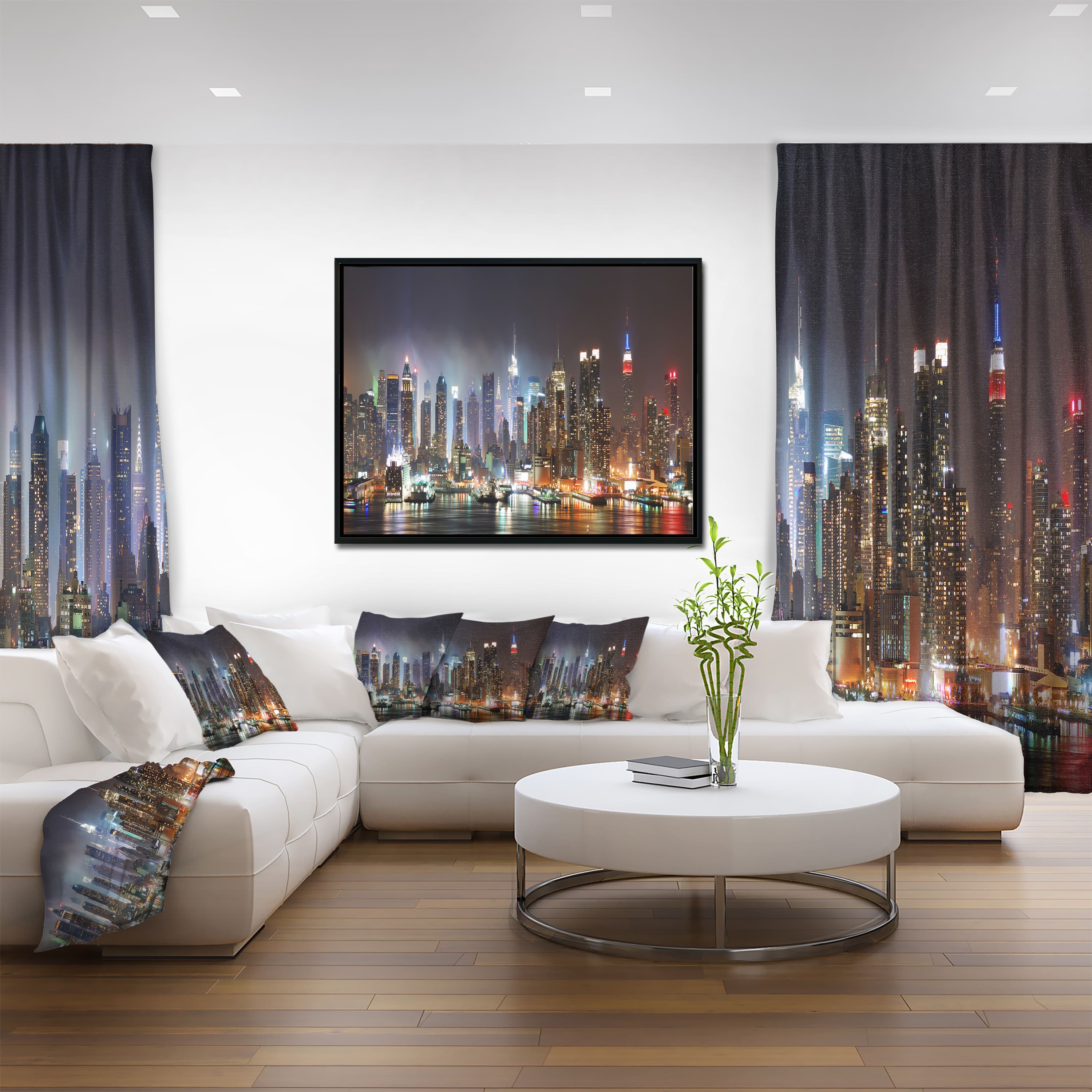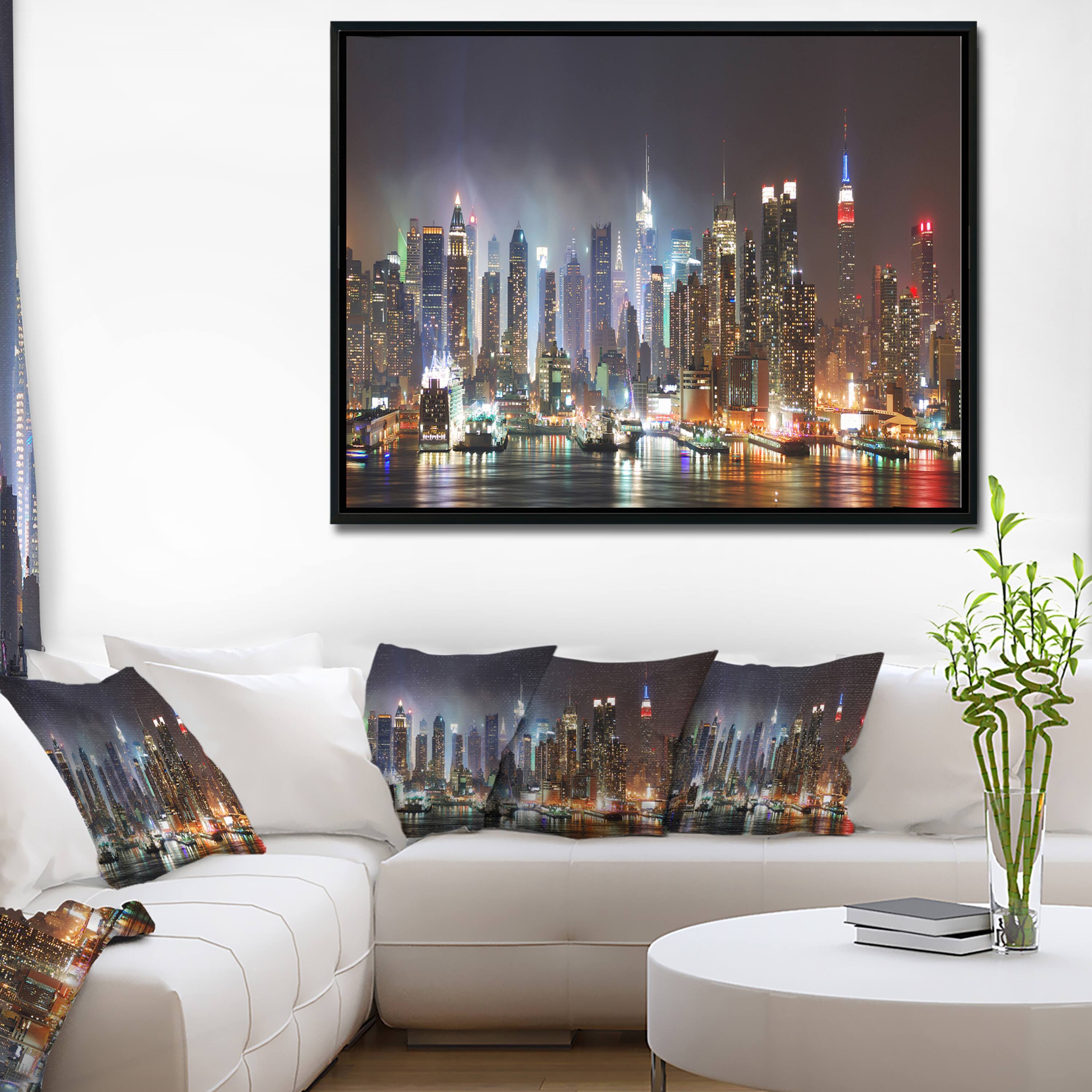 Designart - Lit NYC Manhattan Skyline - Cityscape Photo Framed Canvas Print