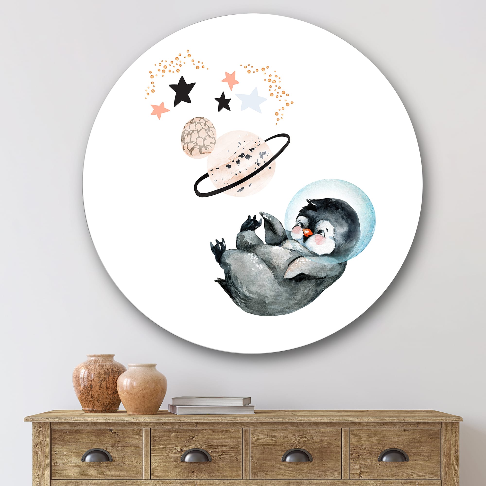 Designart - Little Penguin With Stars and Planets I - Farmhouse Metal Circle Wall Art