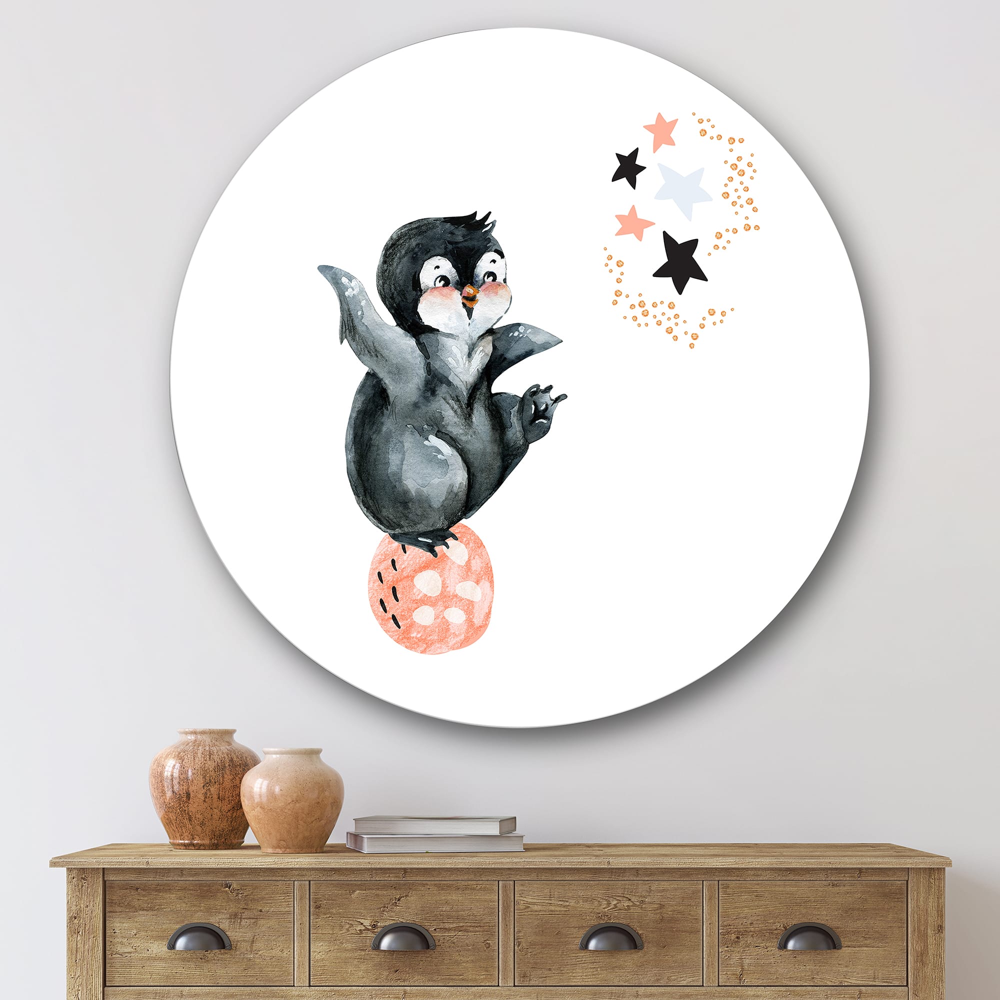 Designart - Little Penguin With Stars and Planets II - Farmhouse Metal Circle Wall Art