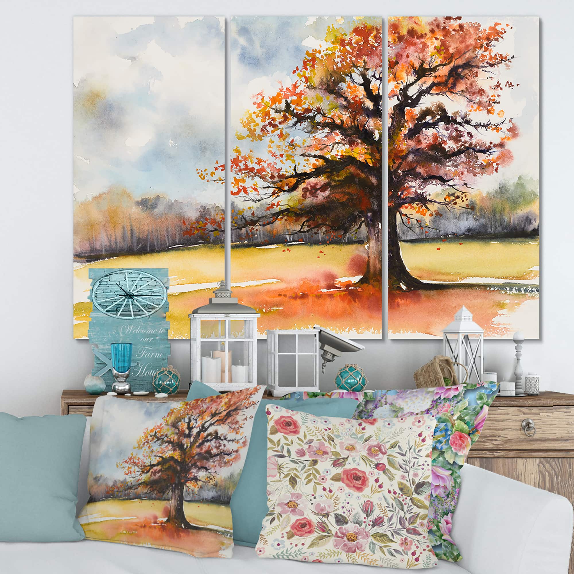 Designart - Lone Oak In The Fields With Autum Leaves - Traditional Canvas Wall Art Print