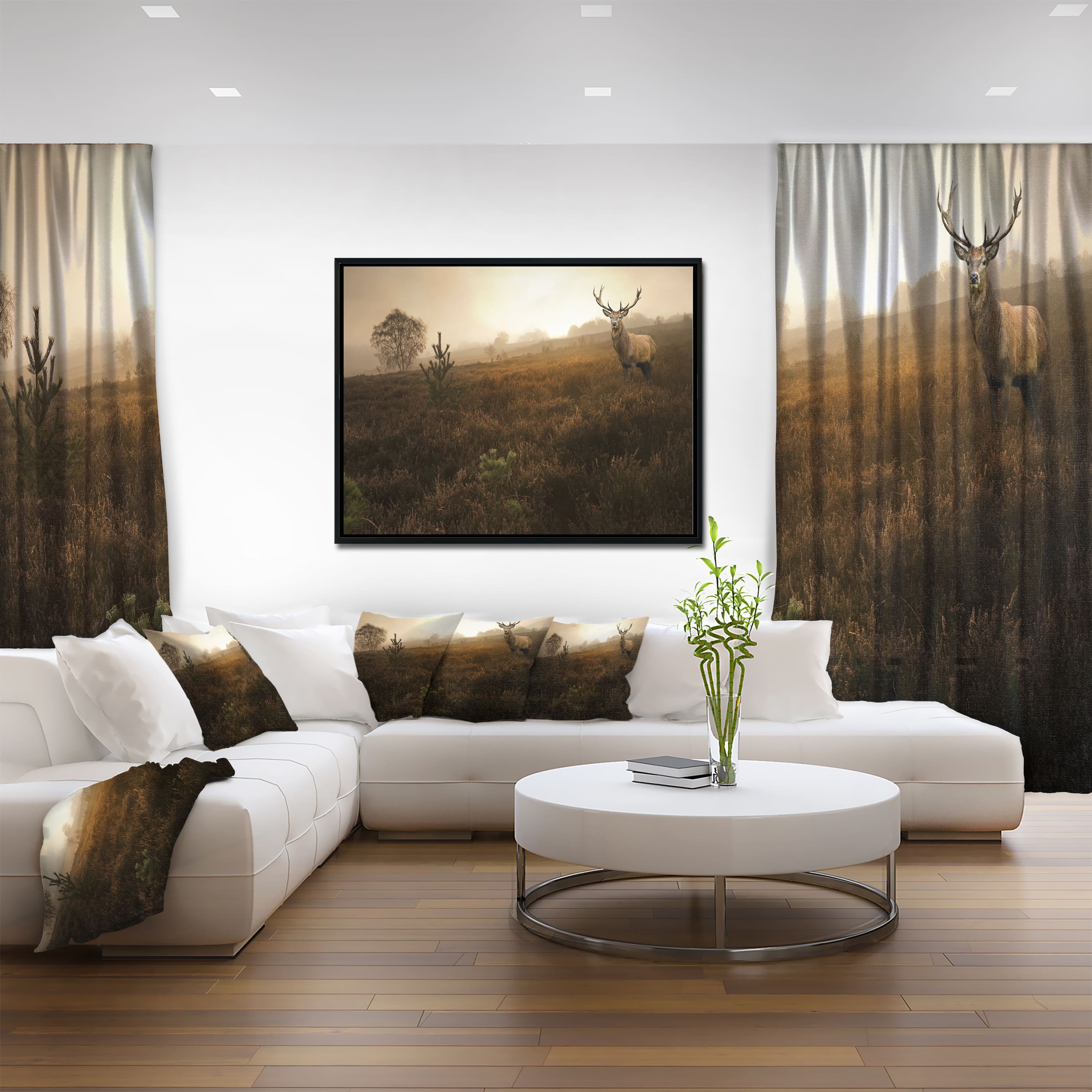 Designart - Mist Forest with Red Deer Stag - Landscape Photo Canvas Art Print in Black Frame
