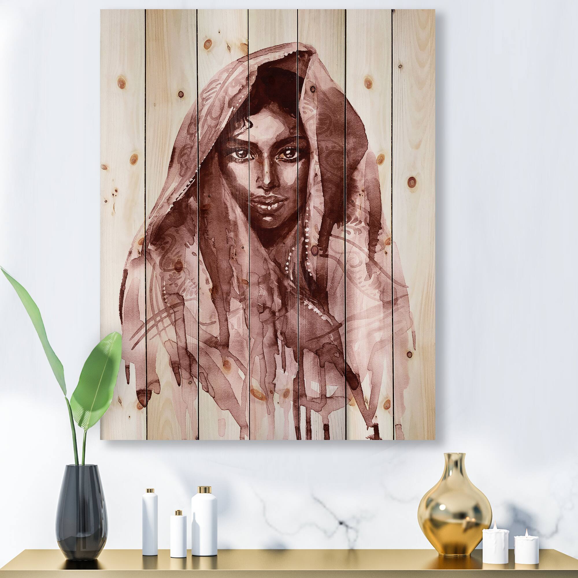 Designart - Monochrome Portrait of Young Indian Woman II - Modern Print on Natural Pine Wood