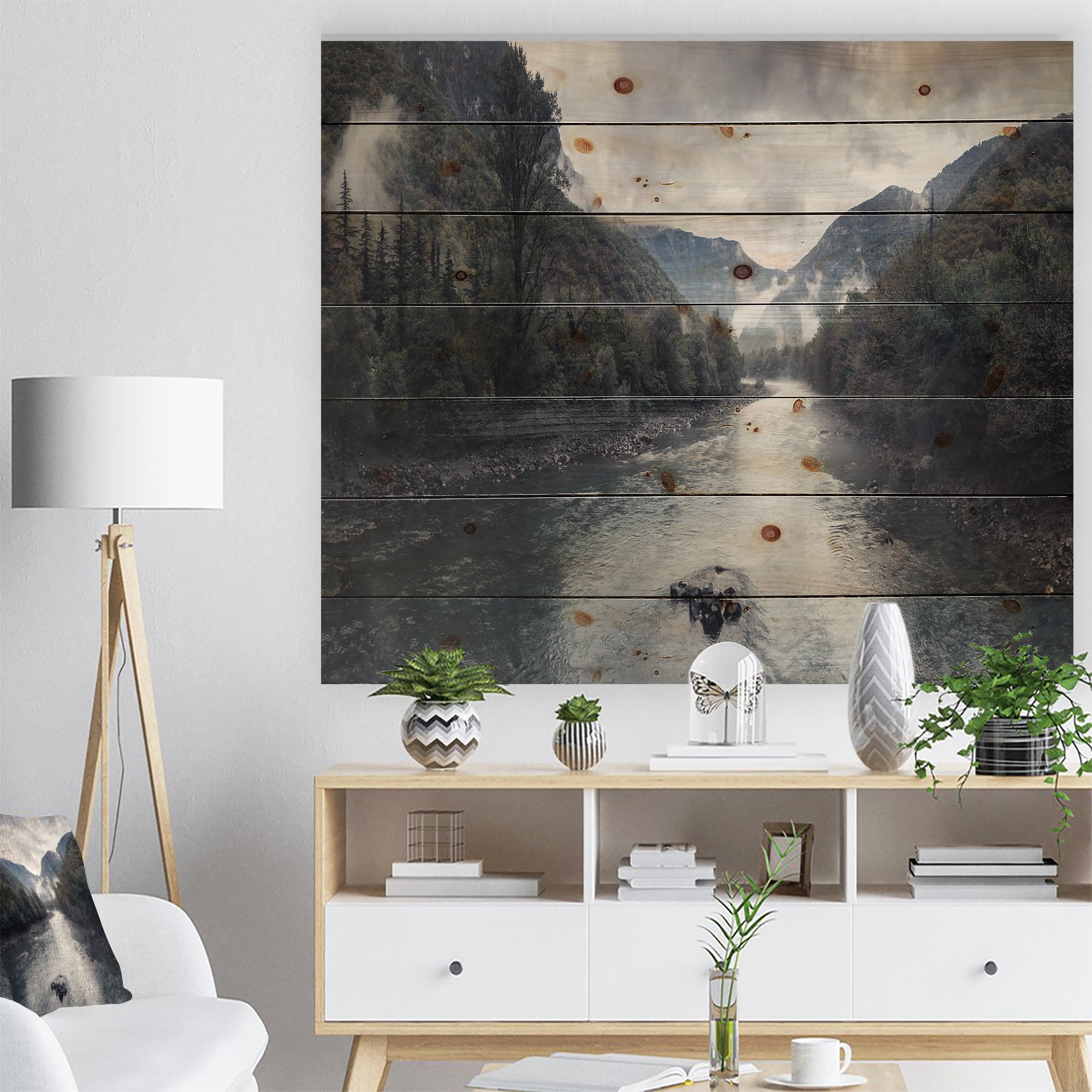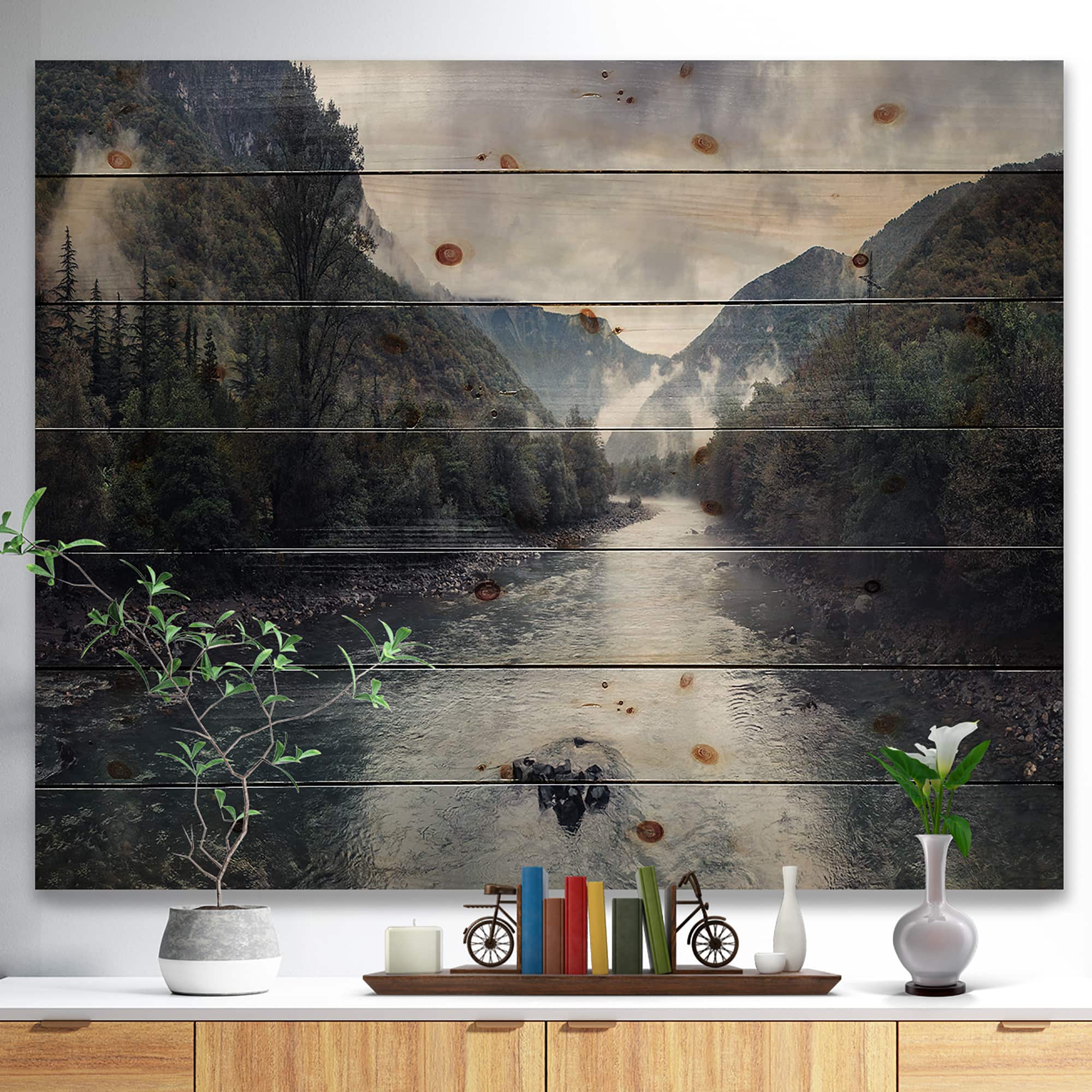 Designart - Mountain River with Fog and Rain - Modern Seascape Print on Natural Pine Wood
