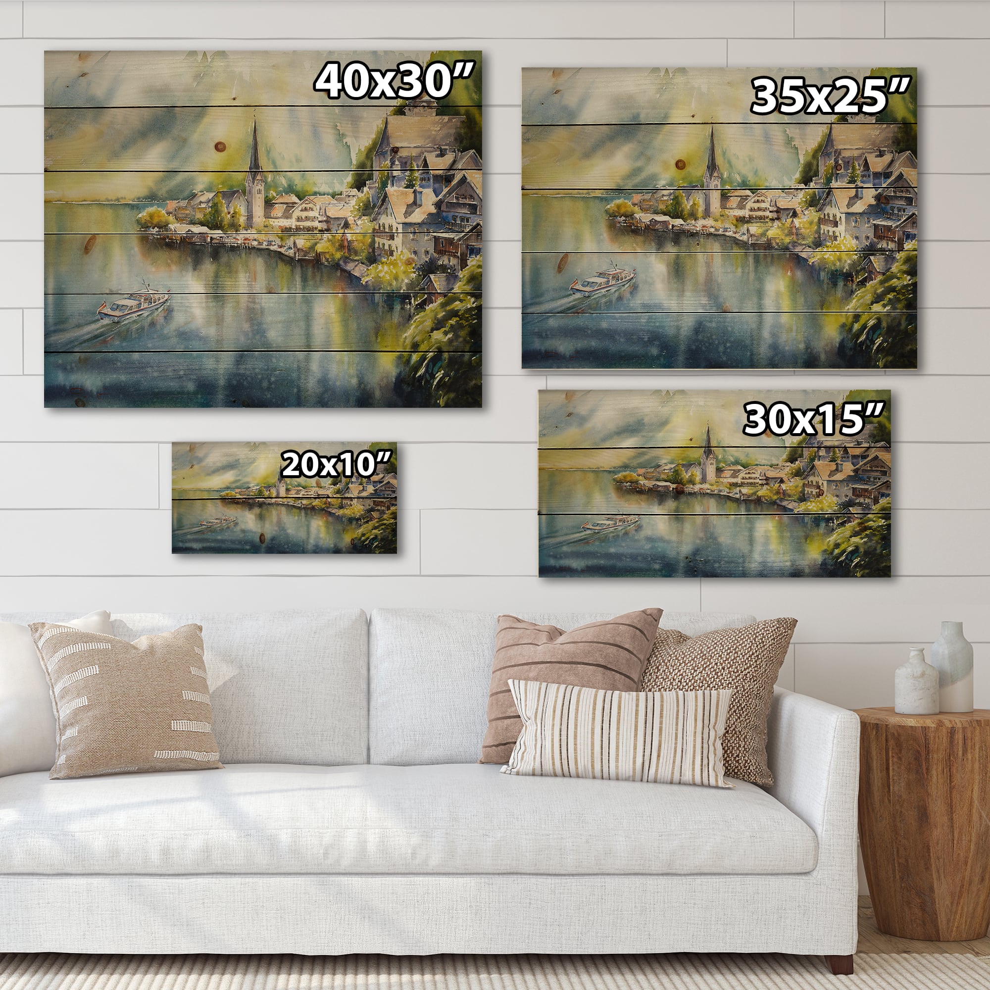 Designart - Mountain Village By The River In Austria - Nautical & Coastal Print on Natural Pine Wood