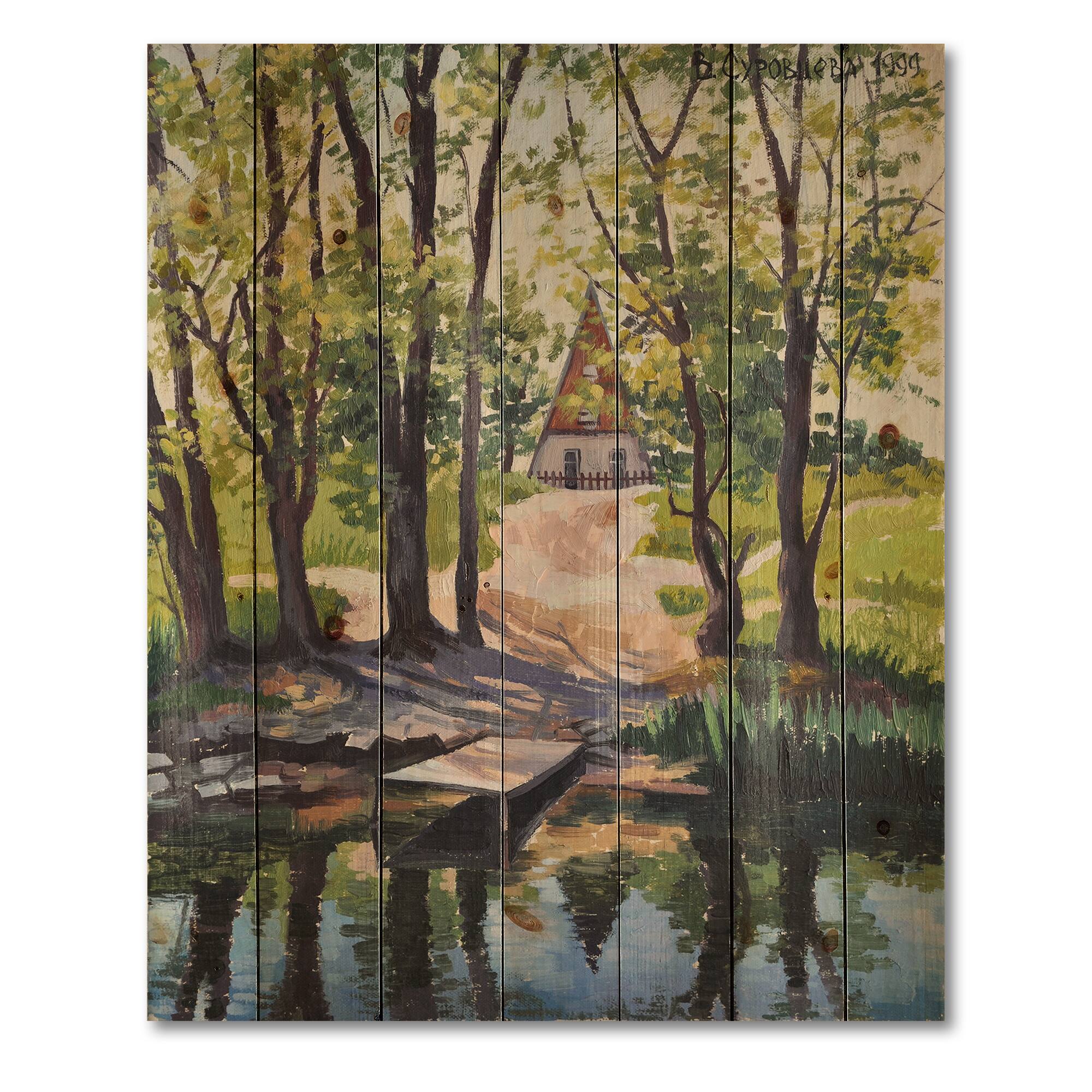 Designart - Mysterious House By The River In The Woods - Lake House Print on Natural Pine Wood