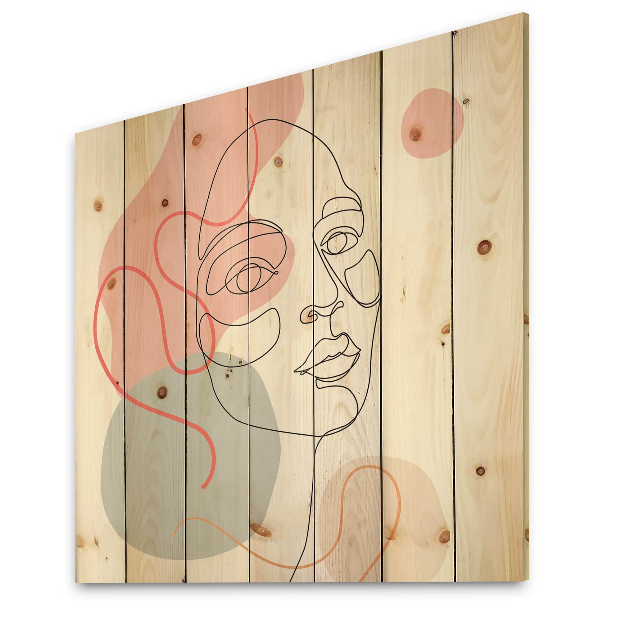 Designart - One Line Drawing of Young Woman In Pastel Tones - Modern Print on Natural Pine Wood