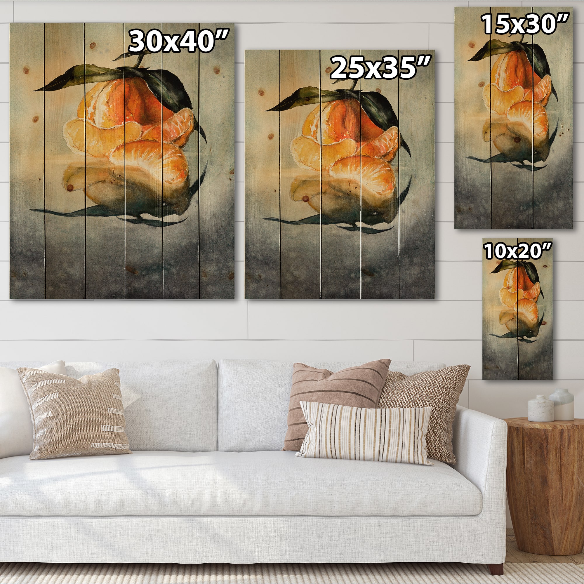 Designart - One Peeled Fresh Orange Mandarin With Green Leaves - Traditional Print on Natural Pine Wood