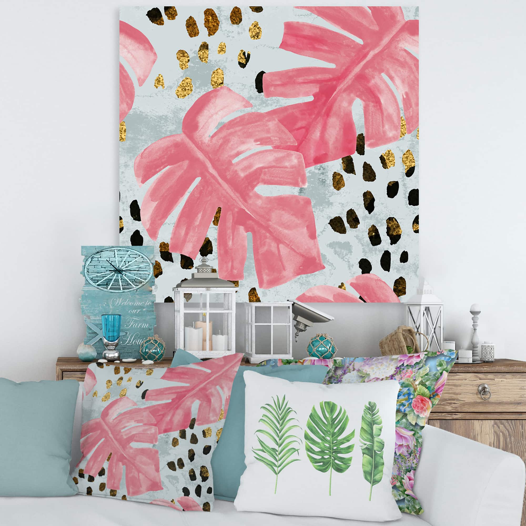Designart - Pink Colored Monstera On Rough Brush Strokes II - Tropical Canvas Wall Art Print