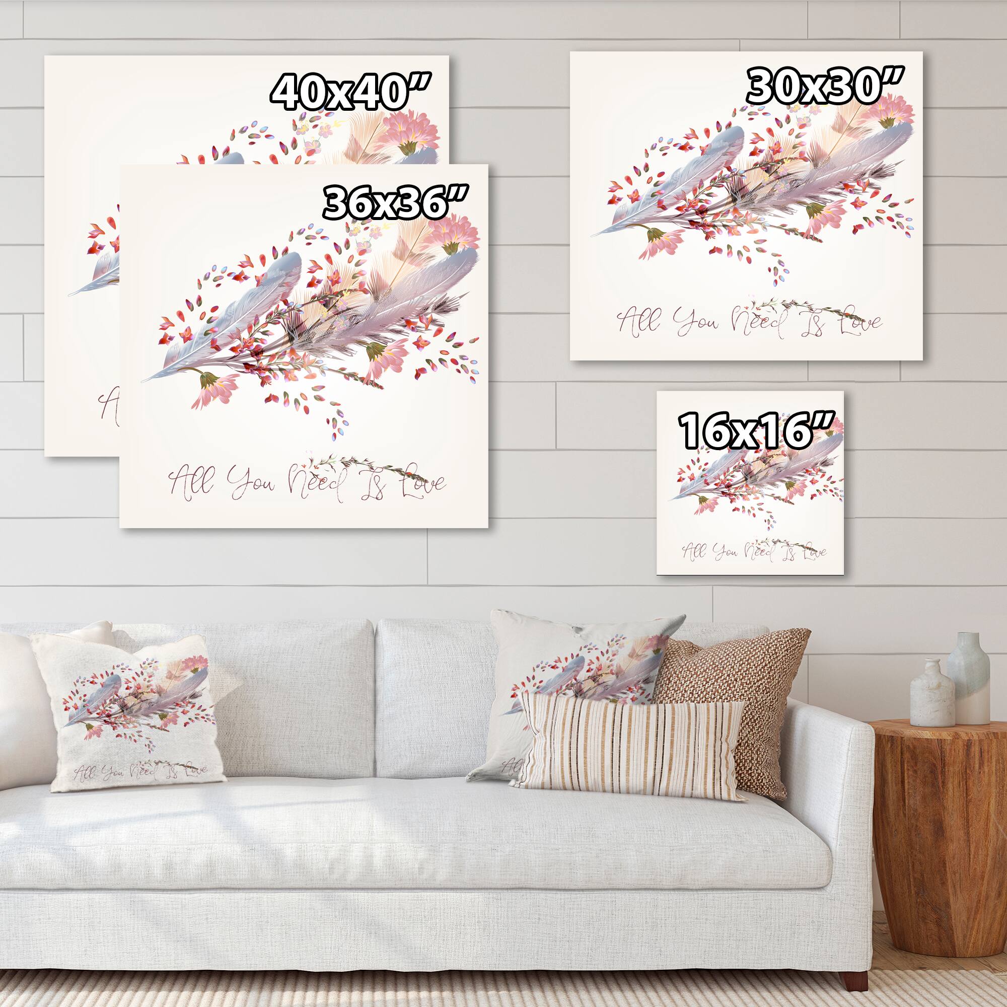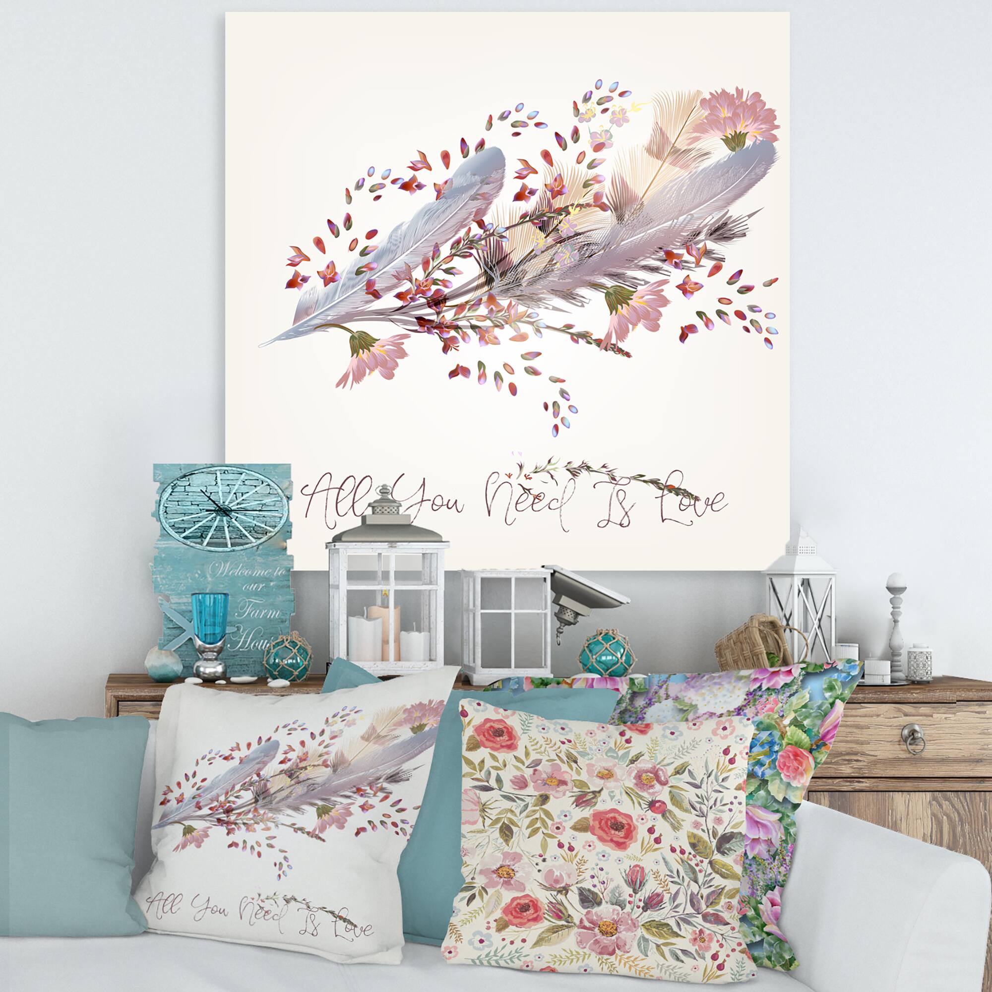 Designart - Pink Feathers and Bird All You Need Is Love - Bohemian & Eclectic Canvas Wall Art Print