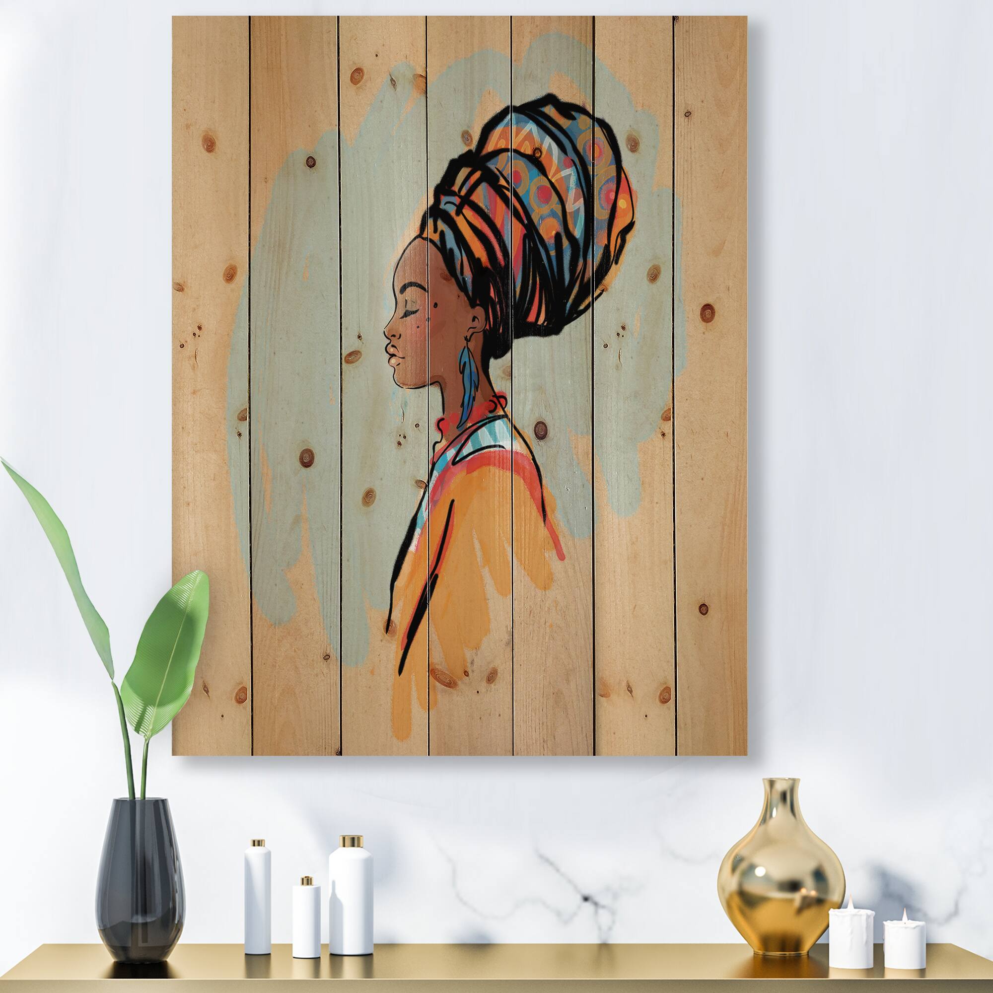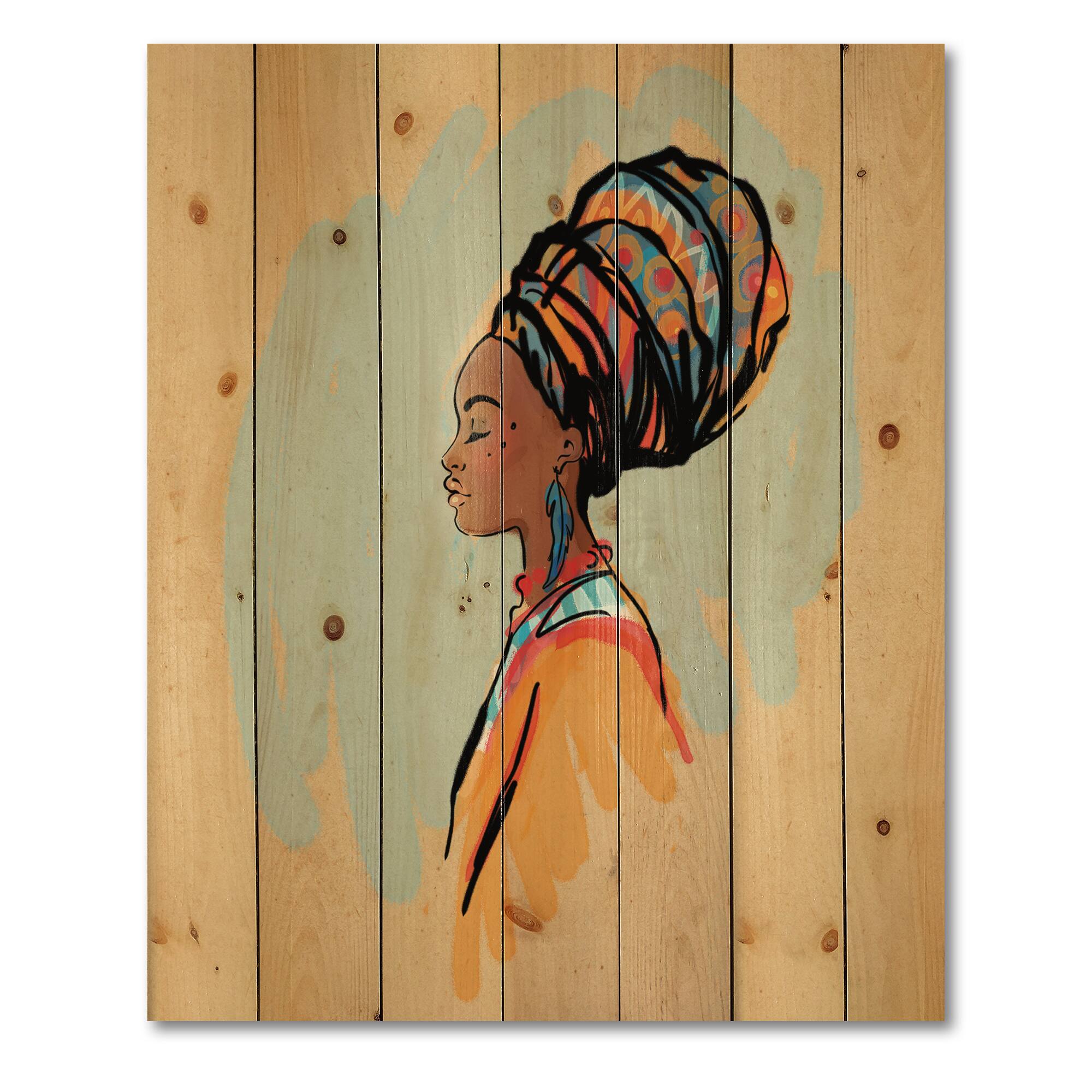 Designart - Portrait of Afro American Woman With Turban II - Modern Print on Natural Pine Wood