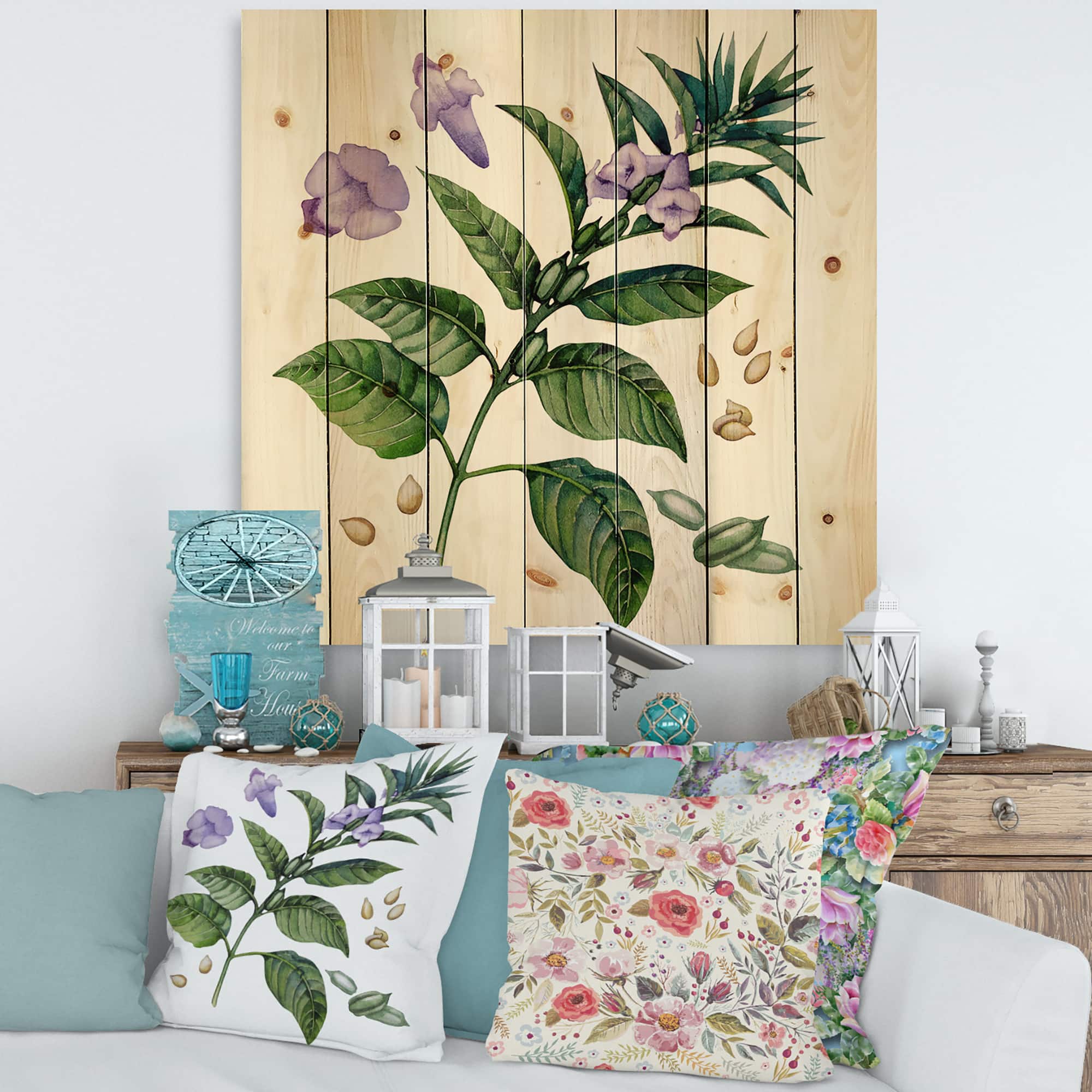 Designart - Purple Sesame Flowers WIth Green Leaves - Traditional Print on Natural Pine Wood
