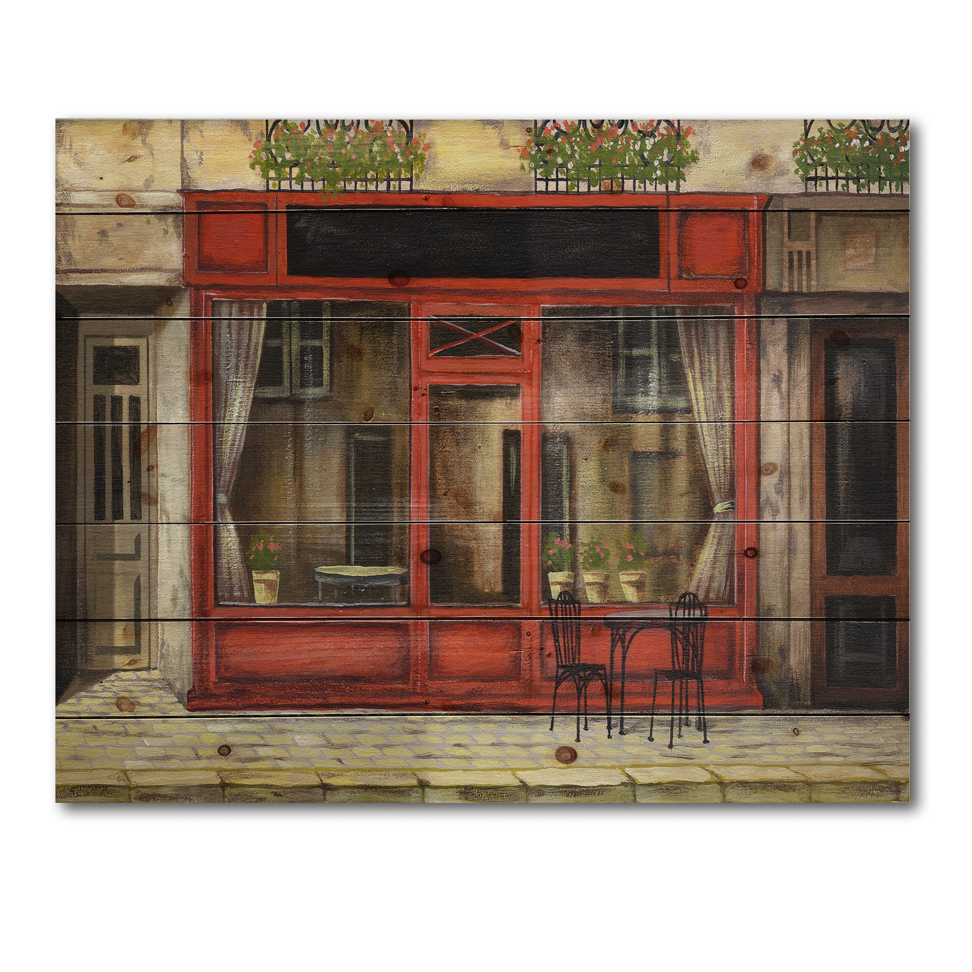 Designart - Red Facade of Charming Shop In Paris I - French Country Print on Natural Pine Wood