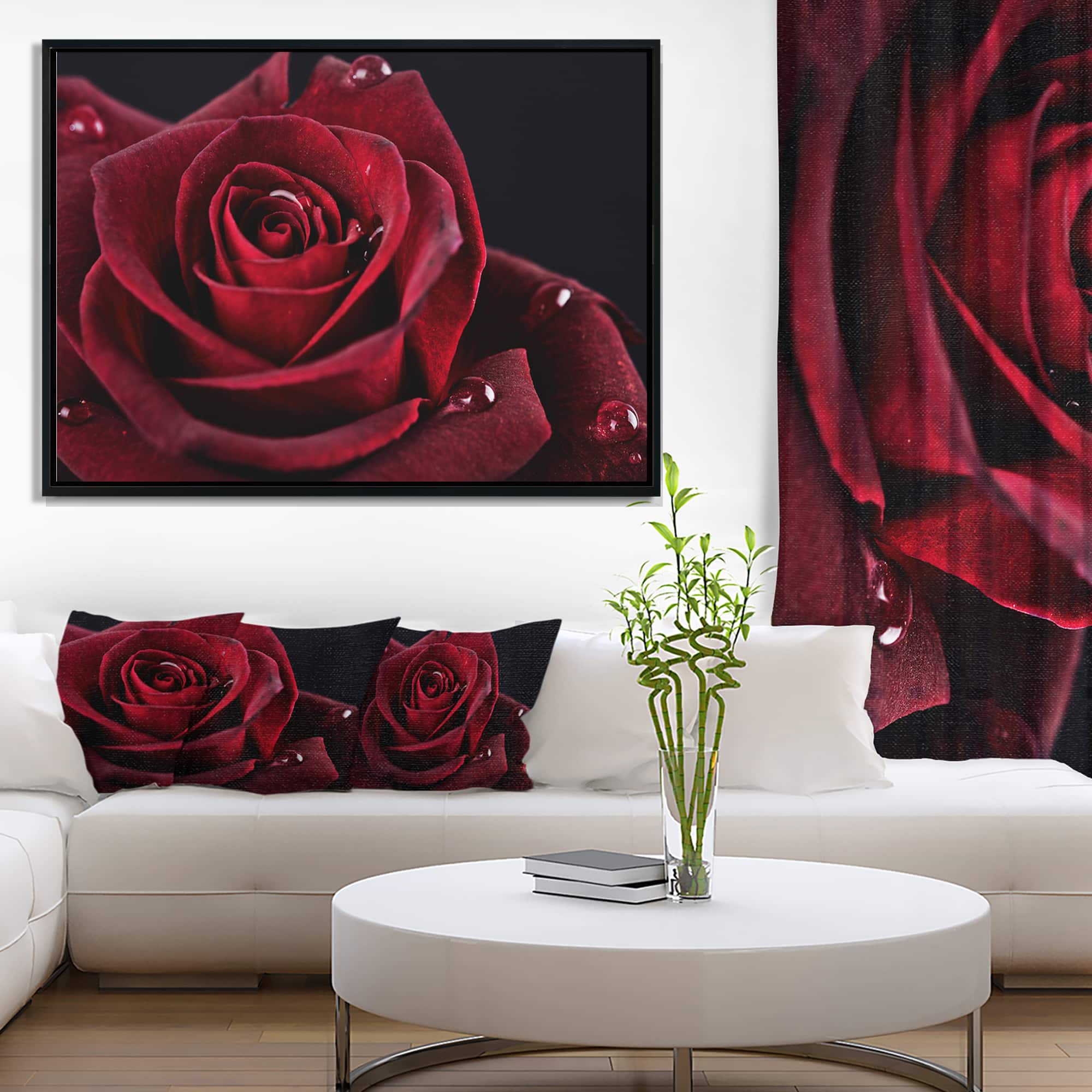 Designart - Red Rose with Raindrops on Black - Flowers Framed Canvas Wall Artwork