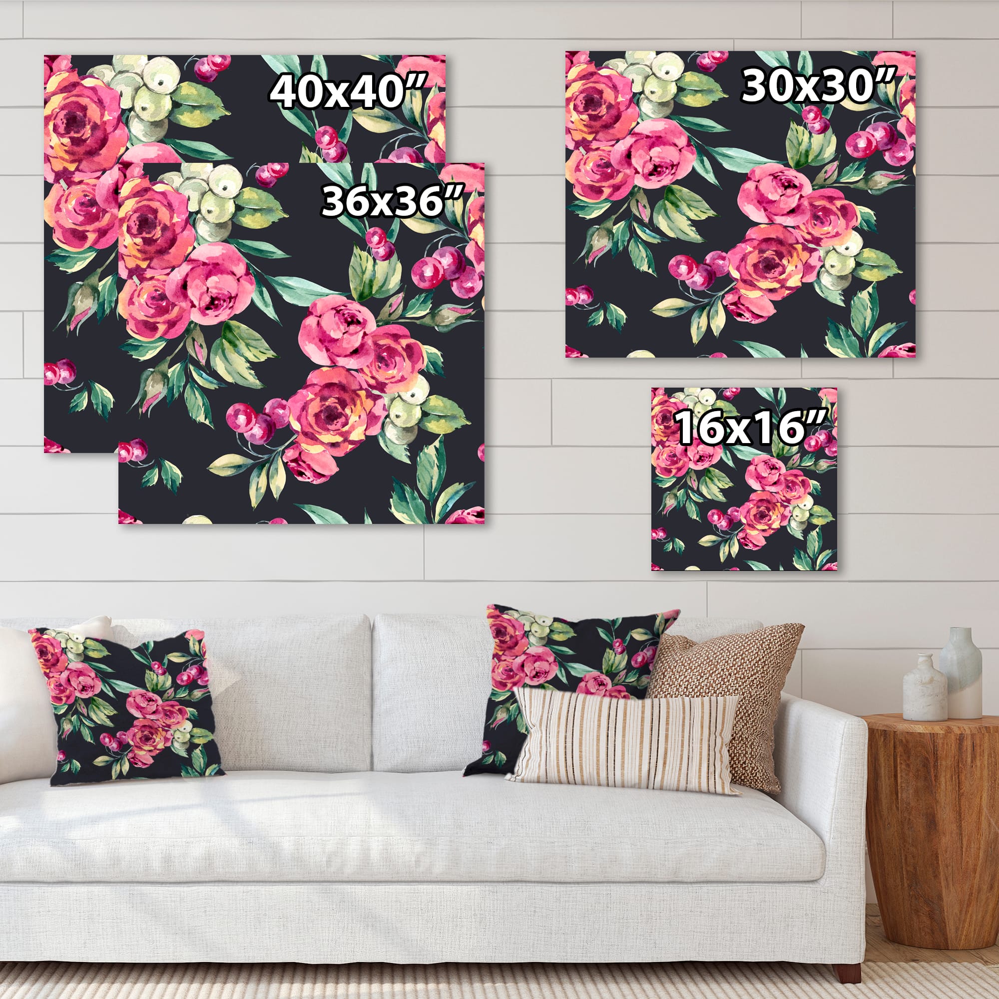 Designart - Red VIntage Roses and Berries On Black - Farmhouse Canvas Wall Art Print