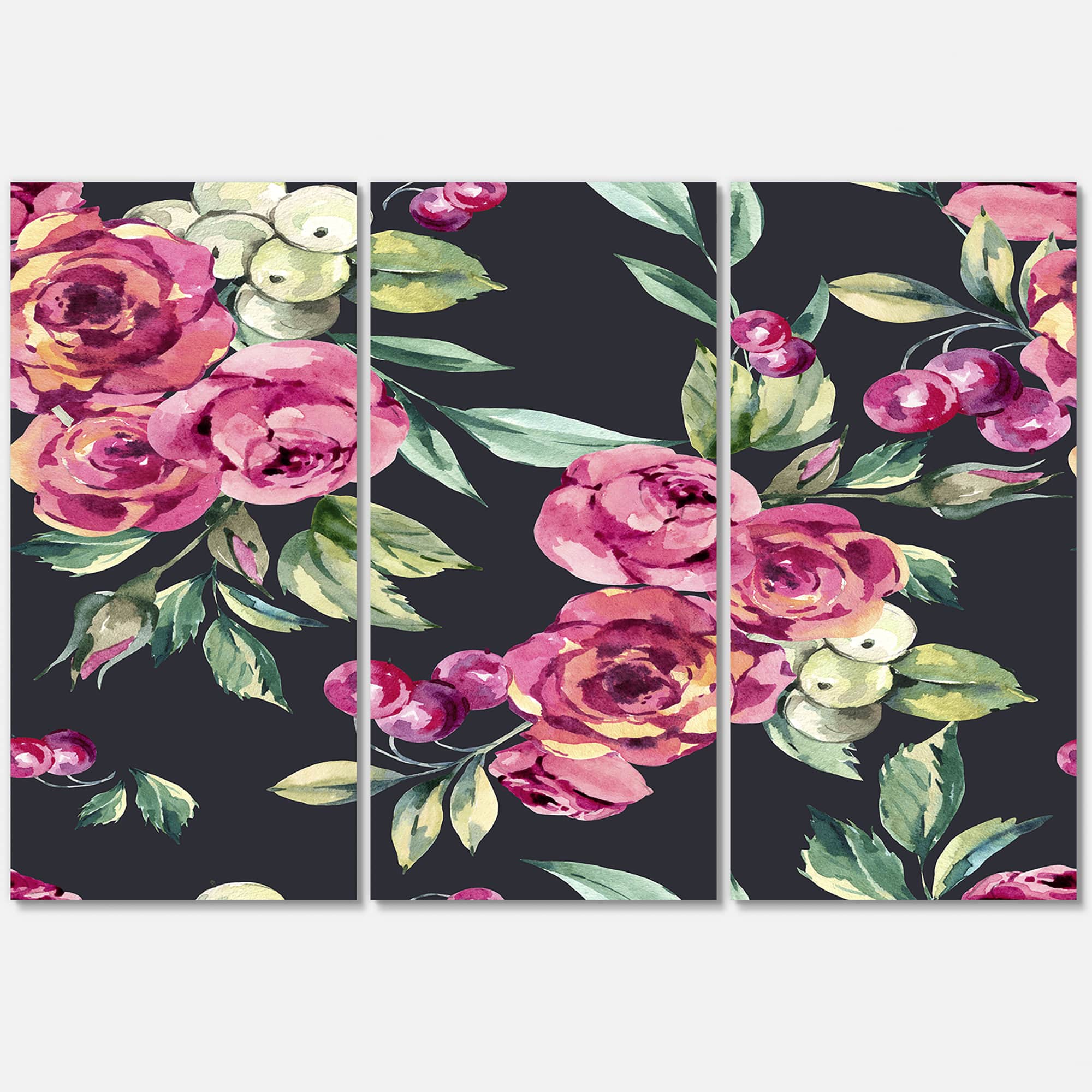 Designart - Red VIntage Roses and Berries On Black - Farmhouse Canvas Wall Art Print