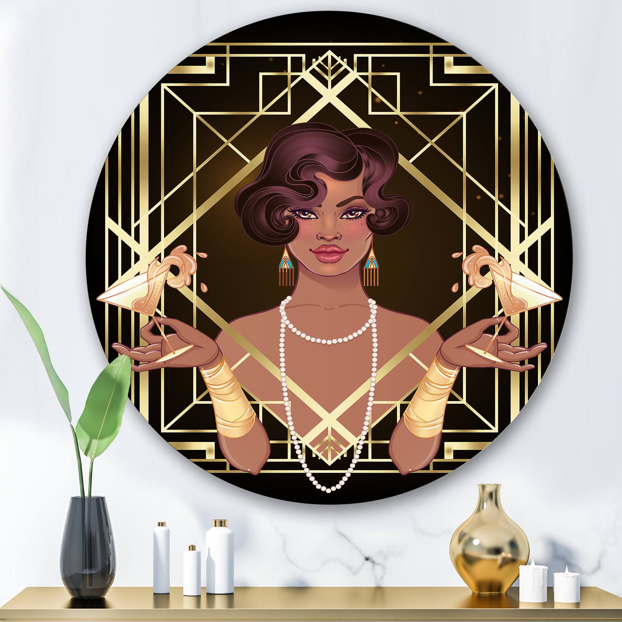 Designart - Retro Women In Golden Art Deco Geometrics I - Modern Metal Circle Wall Art