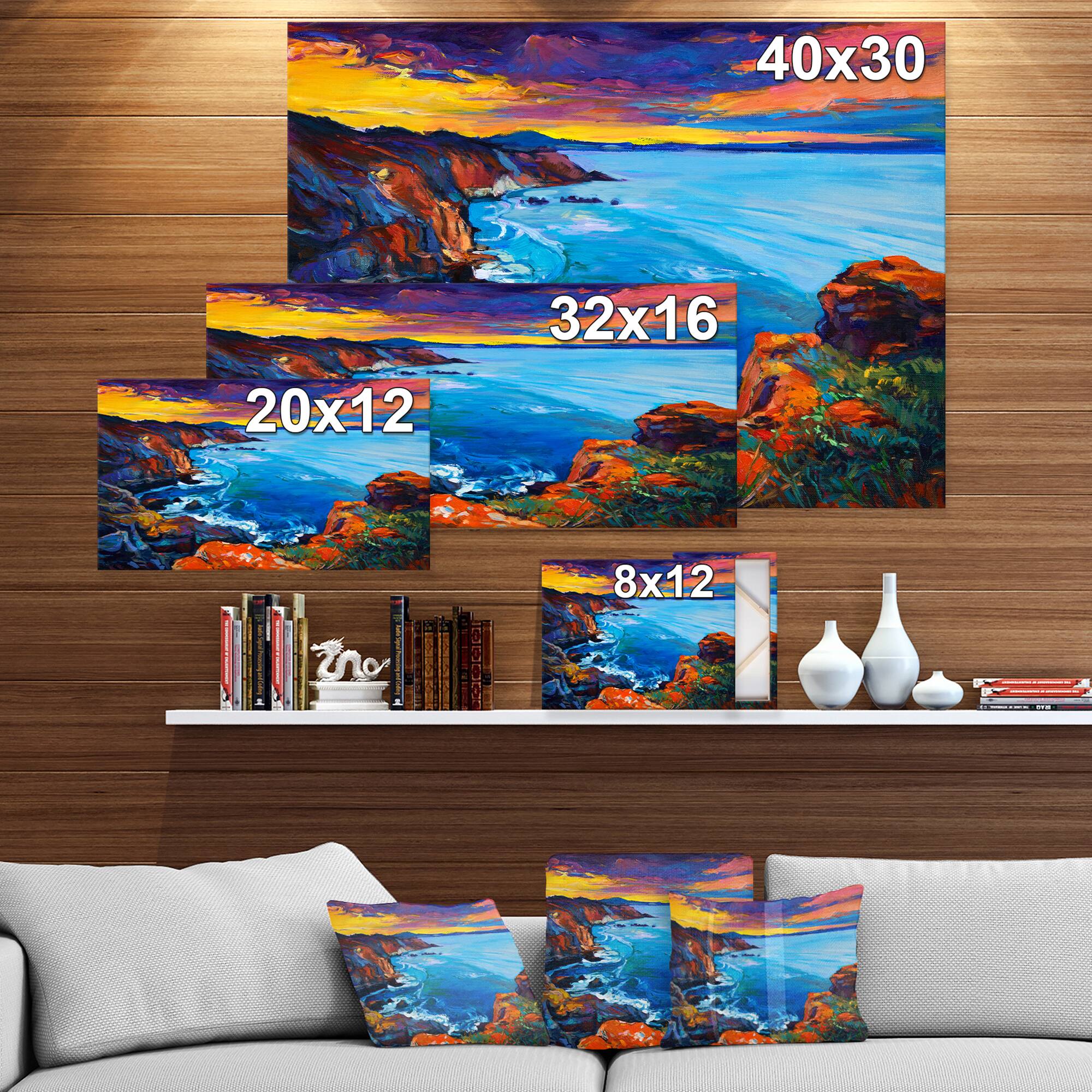 Designart - Rich Golden Sunset Over Ocean and Cliffs - Sea & Shore Painting Print on Wrapped Canvas