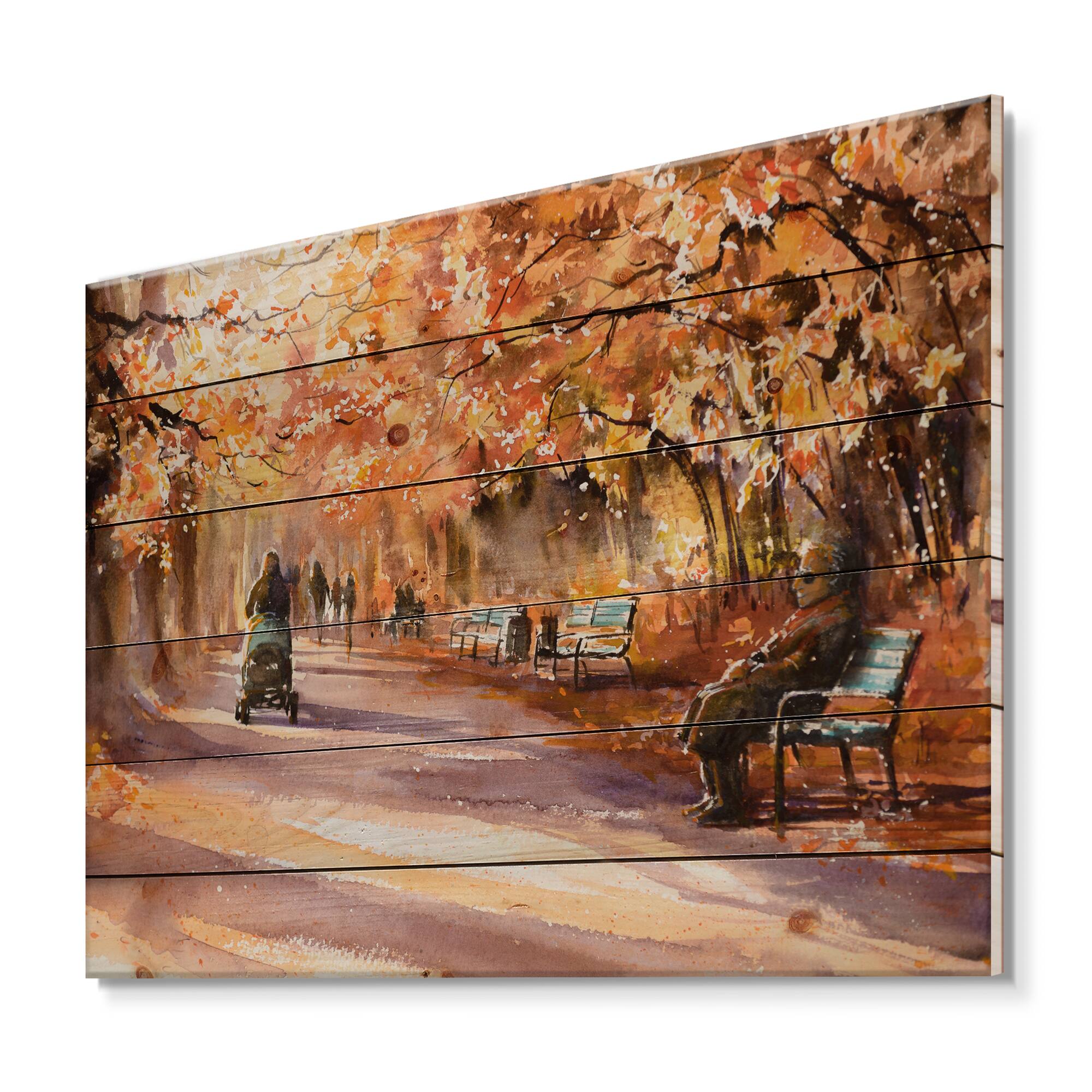 Designart - Road In The Park In Sunny Autumn Day - Country Print on Natural Pine Wood